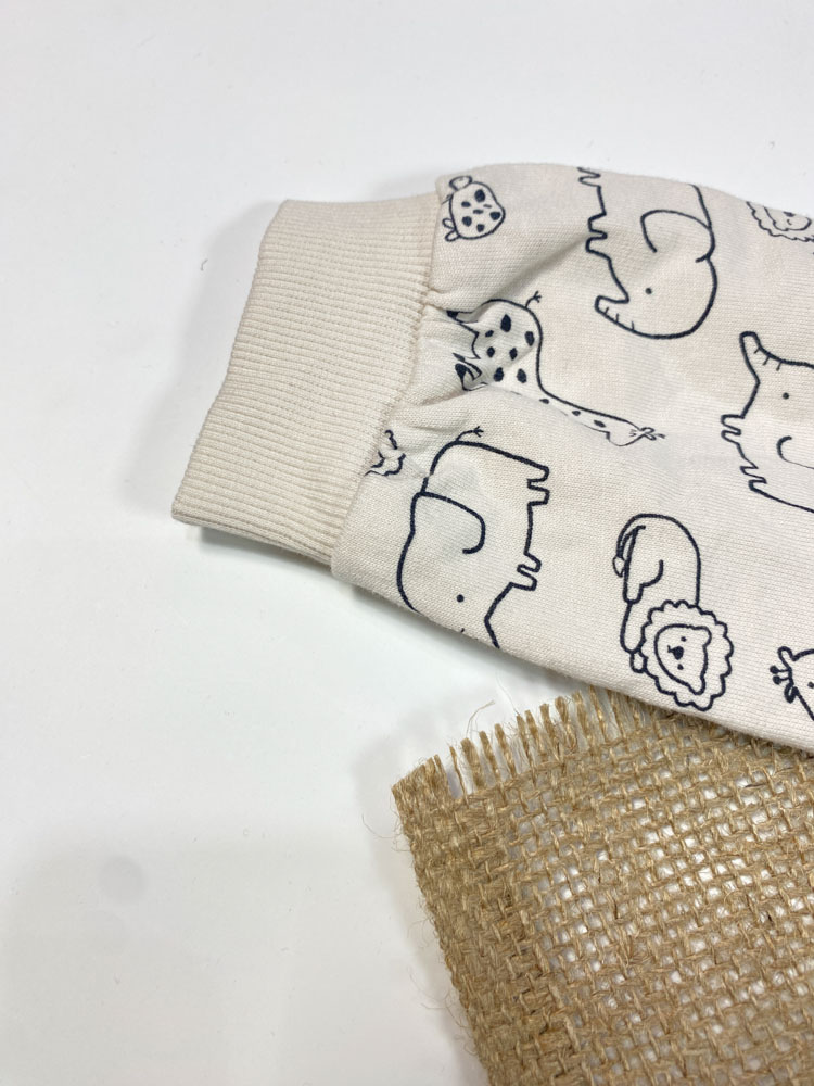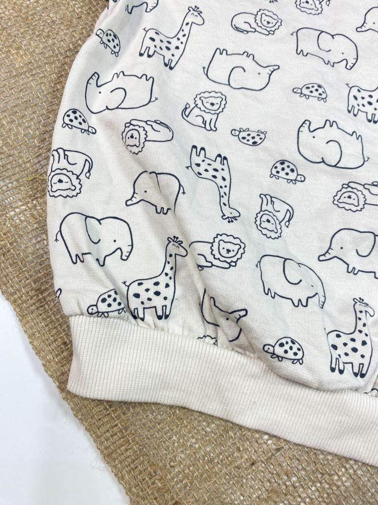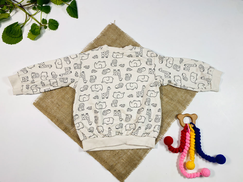 ایراد دار _ بلوز نوزادی آستین بلند طرح حیوانات یقه گرد کرمی رنگ – 9 تا 12 ماه