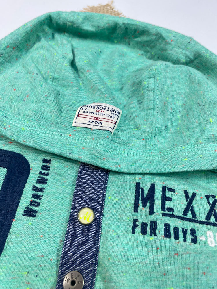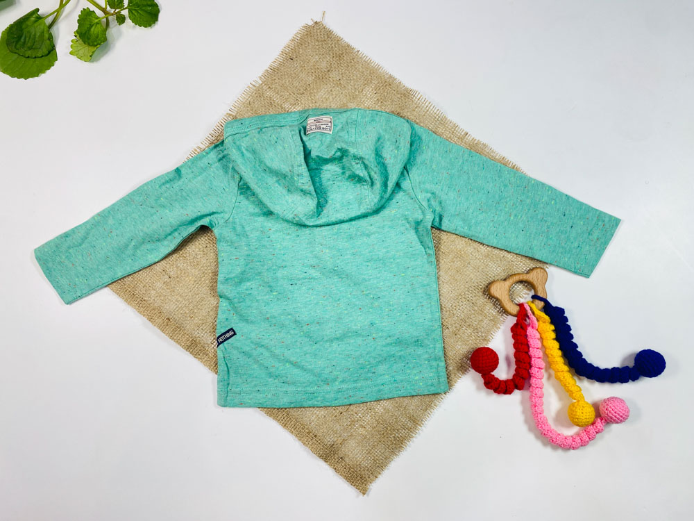 ایراد دار _ بلوز نوزادی پسرانه آستین بلند طرح سه دکمه ای نوشته دار کلاه دار جلو بسته کله غازی رنگ – 9 تا 12 ماه