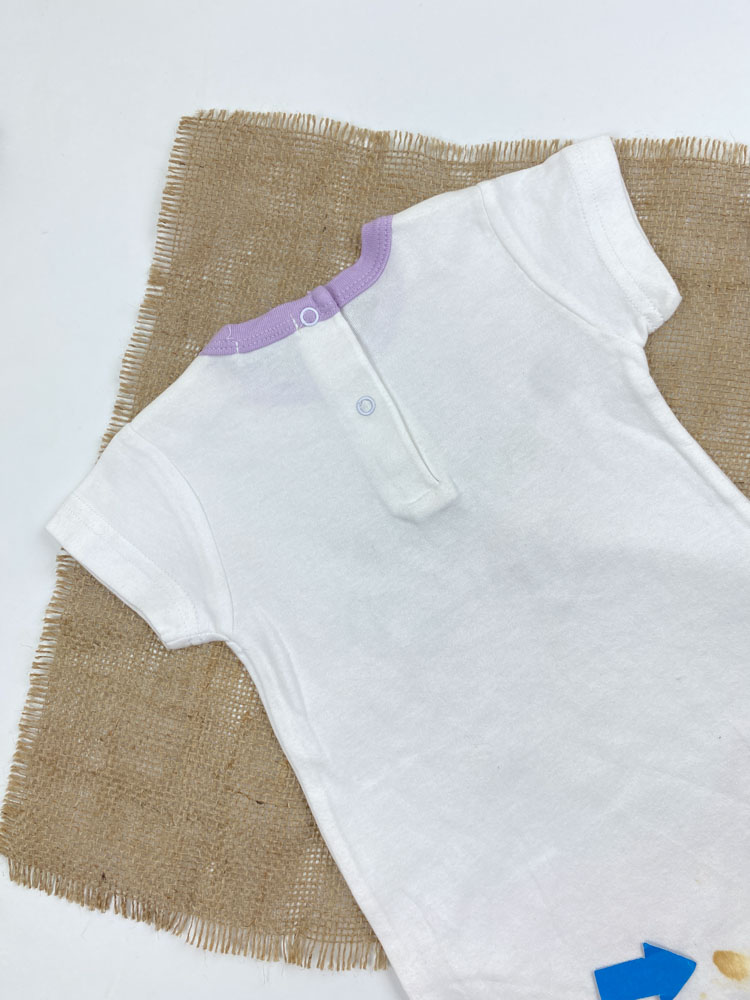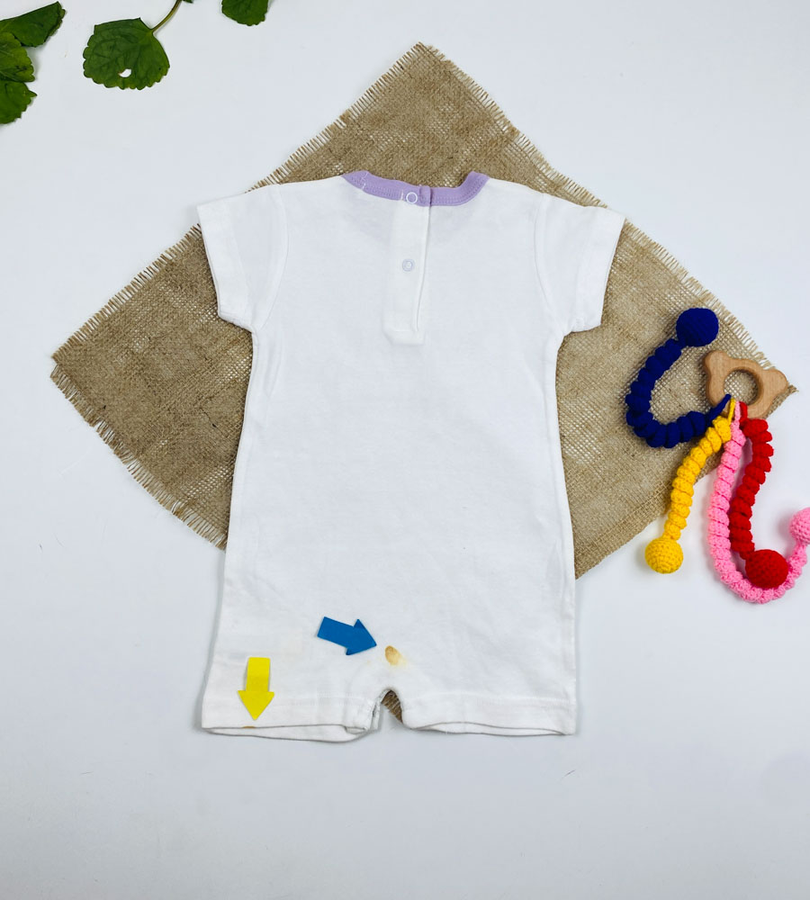 ایراد دار _ رامپر نوزادی دخترانه آستین کوتاه طرح طرح کلبه یقه گرد پشت دکمه ای سفید رنگ