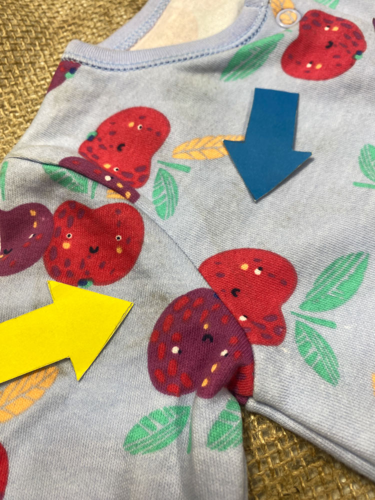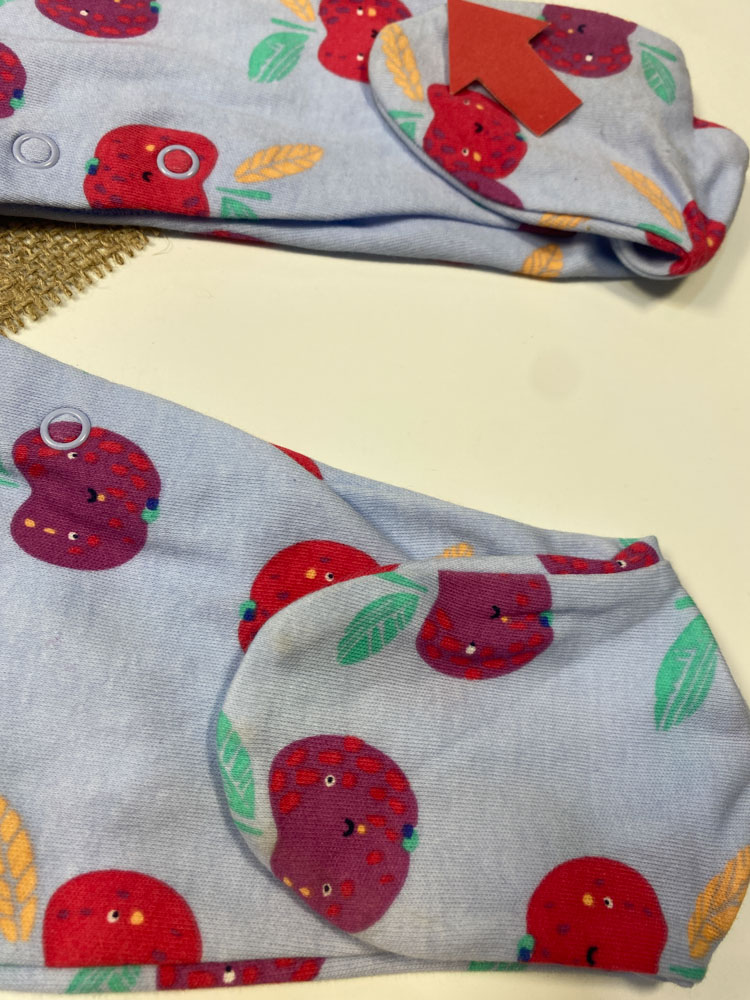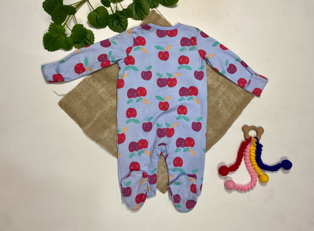 ایراد دار _ سرهمی نوزادی دخترانه آستین بلند طرح سیب و برگ جلو دکمه ای جورابی آبی آسمانی رنگ – 3 تا 6 ماه