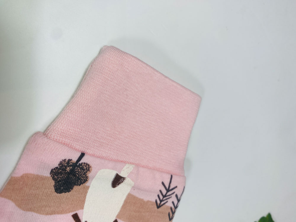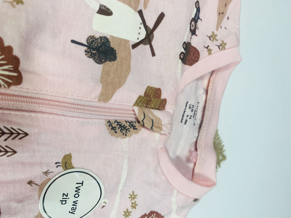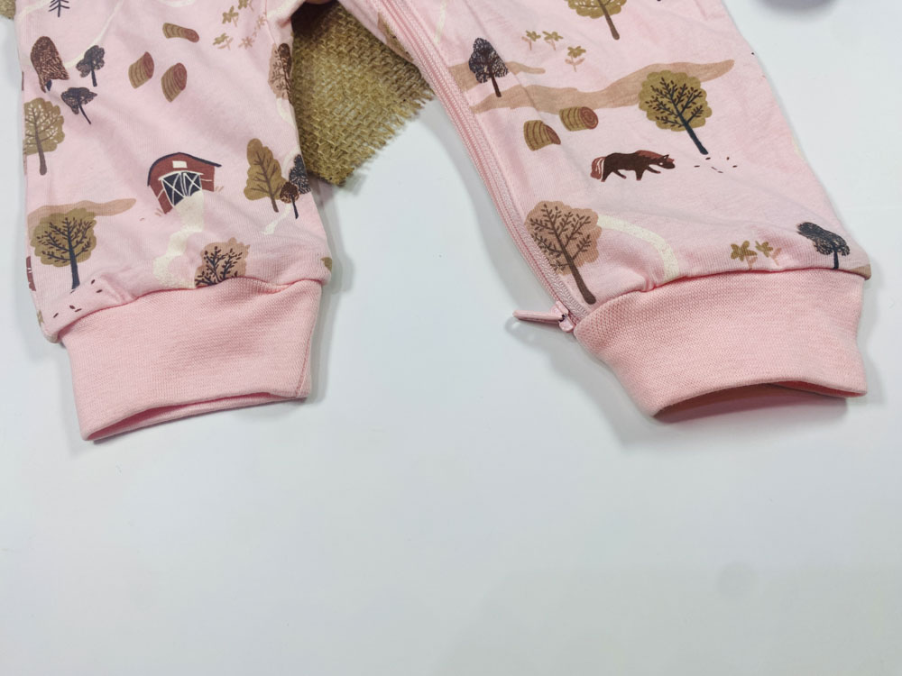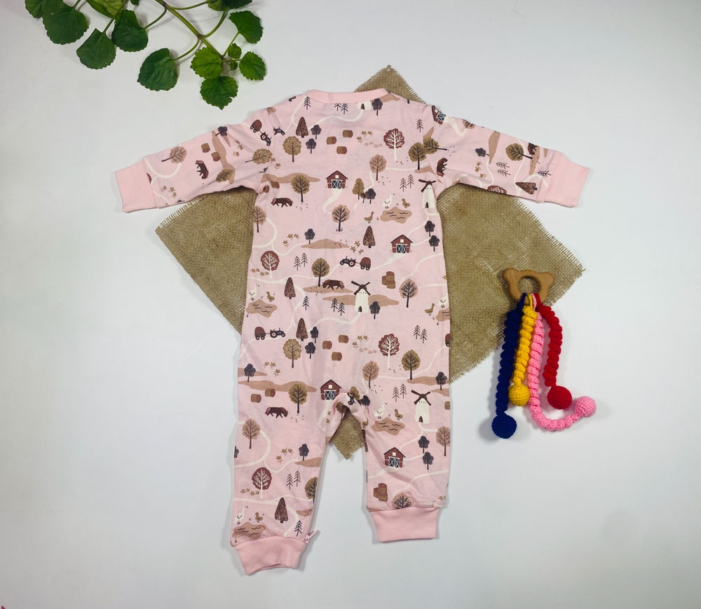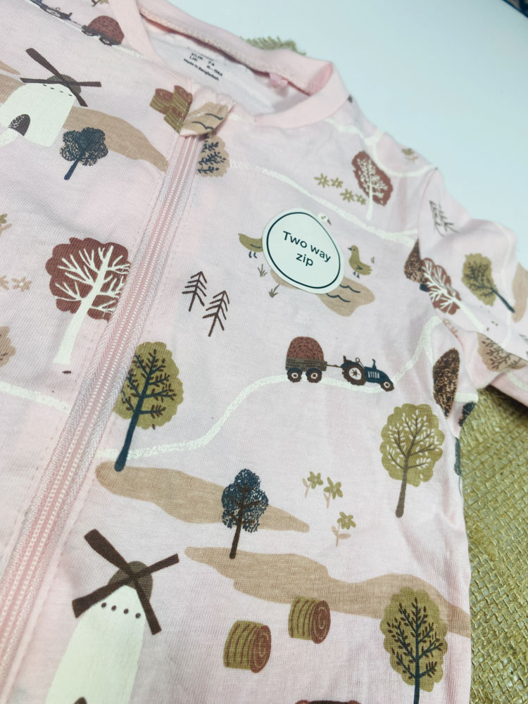 ایراد دار _ سرهمی نوزادی دخترانه آستین بلند برند لیندکس طرح درخت و مزرعه بدون جورابی جلو زیپی صورتی رنگ – 6 تا 9 ماه