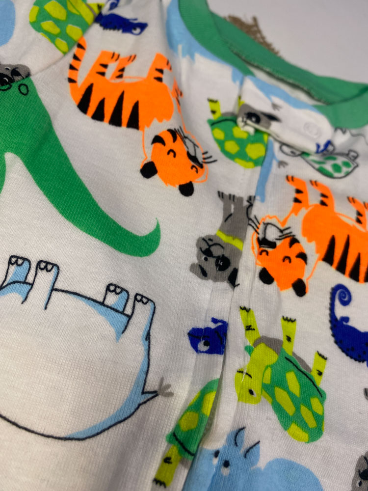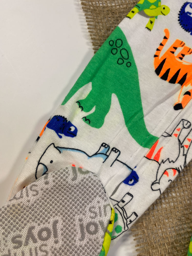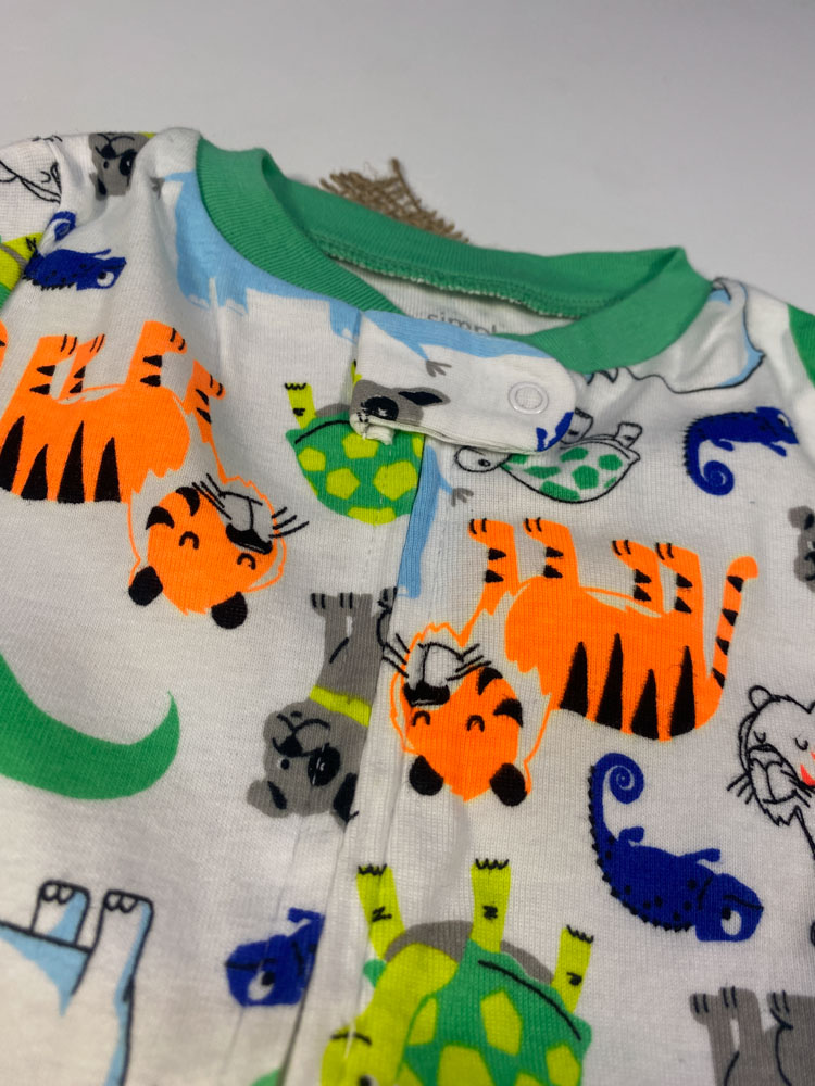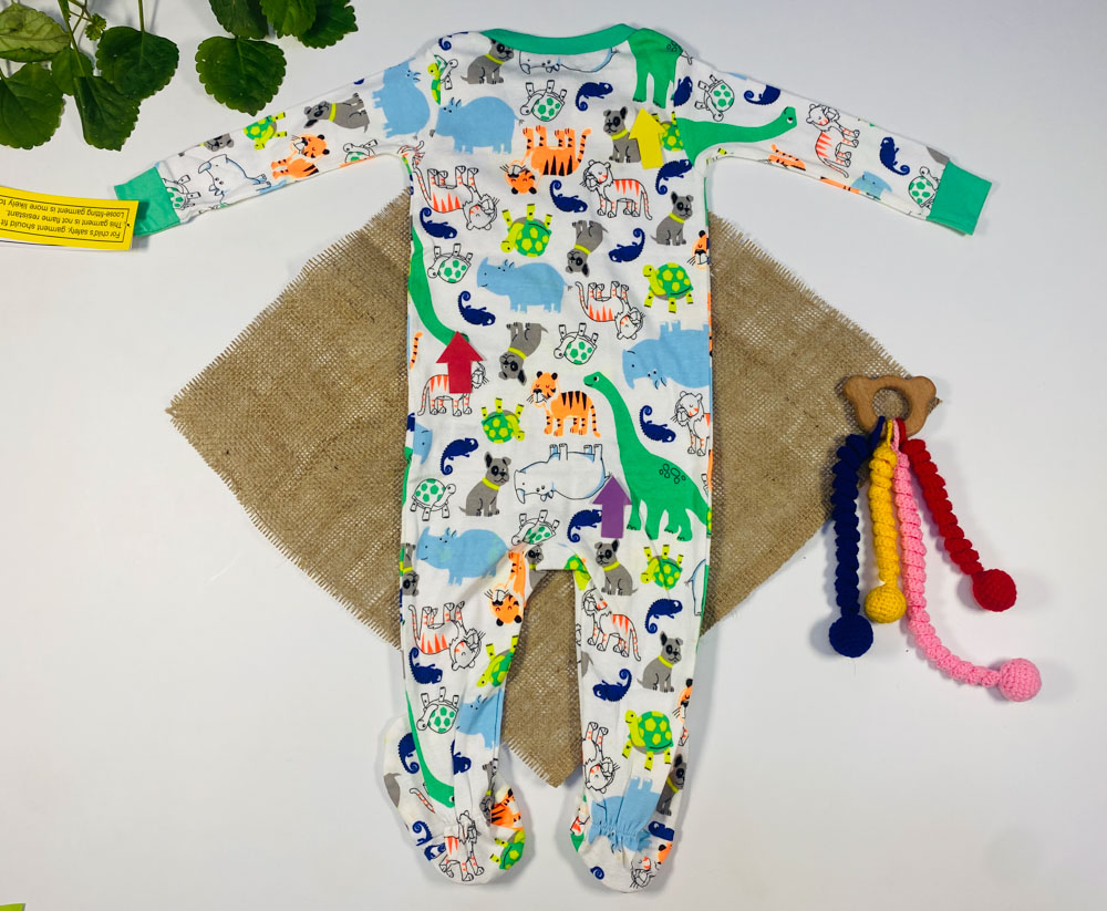 ایراد دار _ سرهمی نوزادی پسرانه آستین بلند طرح طرح حیوانات جورابی جلو زیپی سفید رنگ