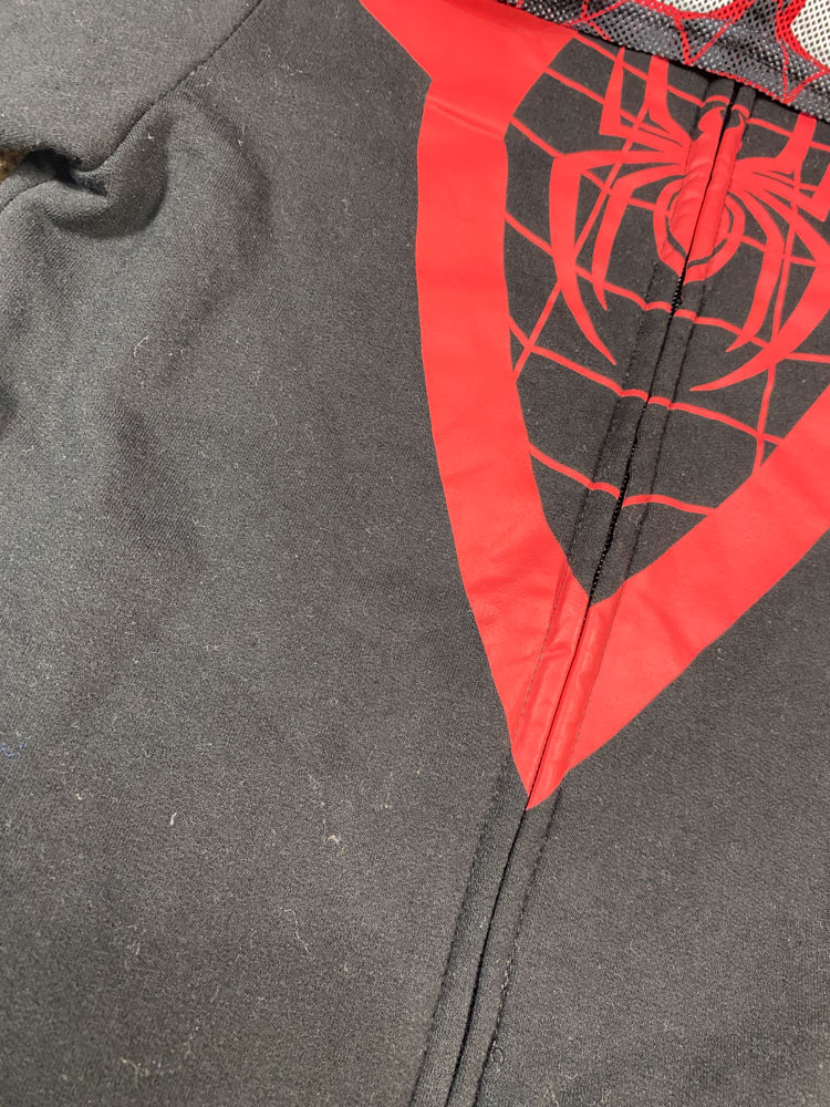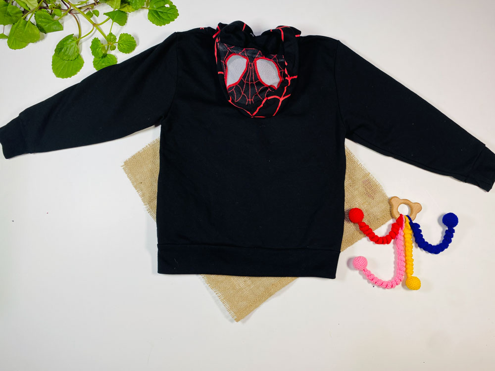 ایراد دار _ سویشرت پسرانه آستین بلند طرح اسپایدرمن جلو زیپی کلاه دار مشکی رنگ – 6 تا 8 سال