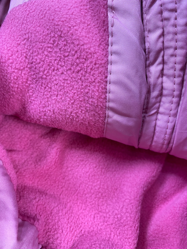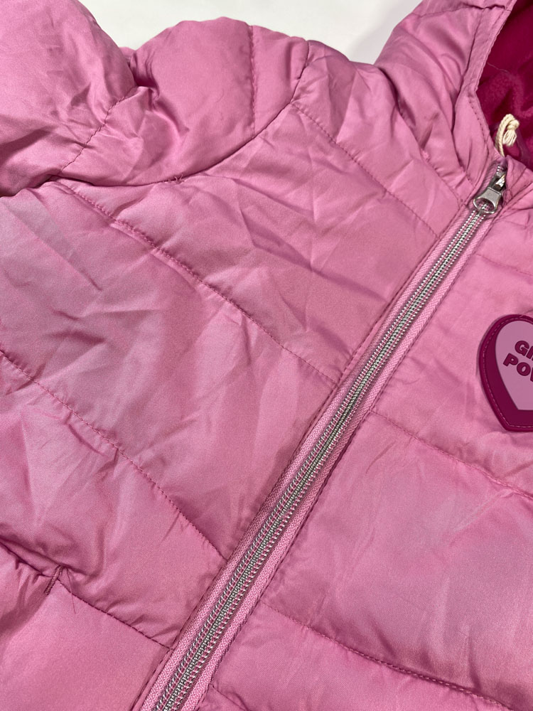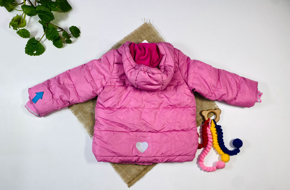 ایراد دار _ کاپشن نوزادی دخترانه آستین بلند طرح قلب کلاه دار جلو زیپ جیب دار صورتی رنگ – 12 تا 24 ماه