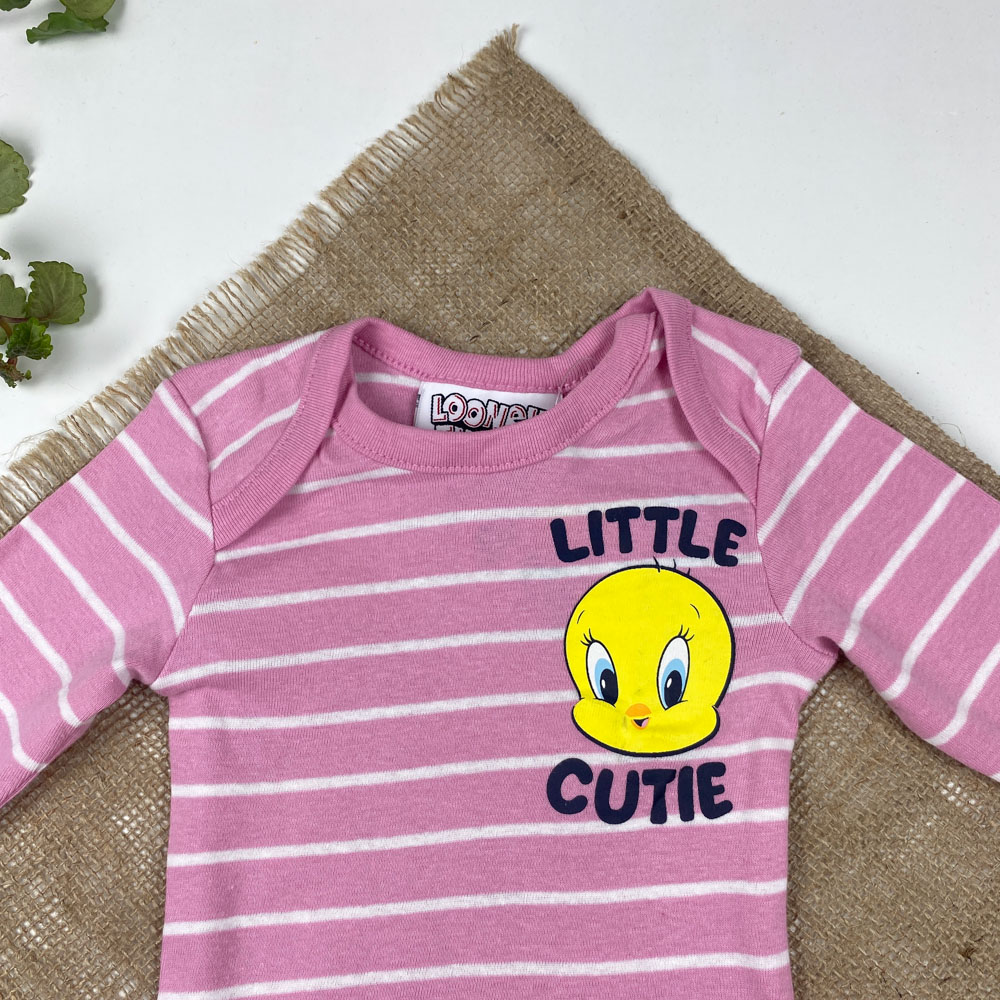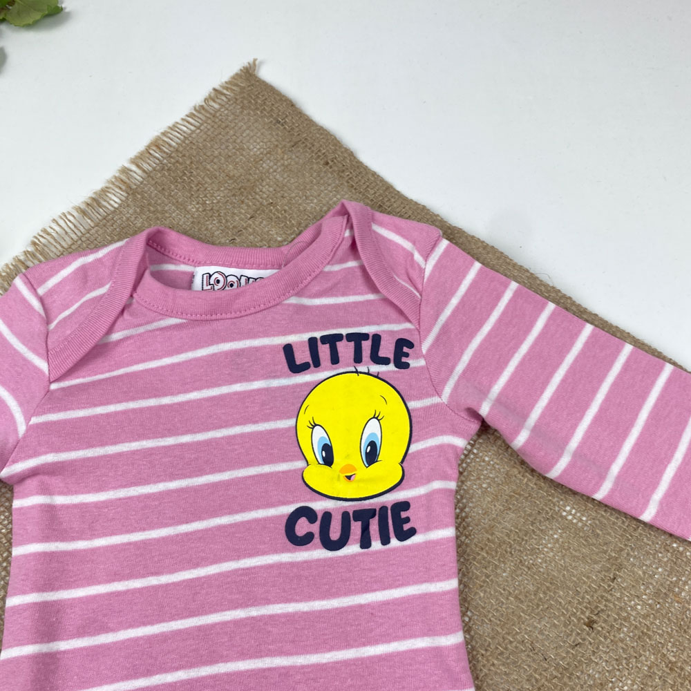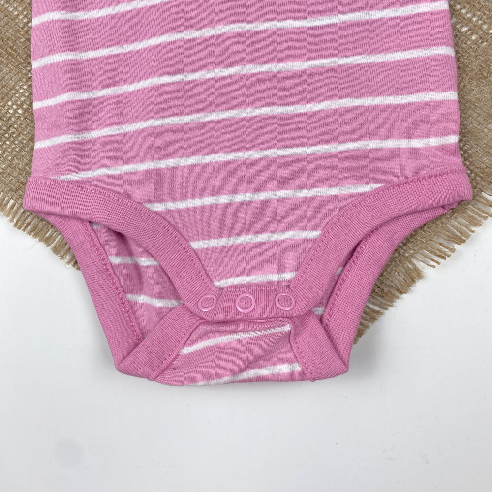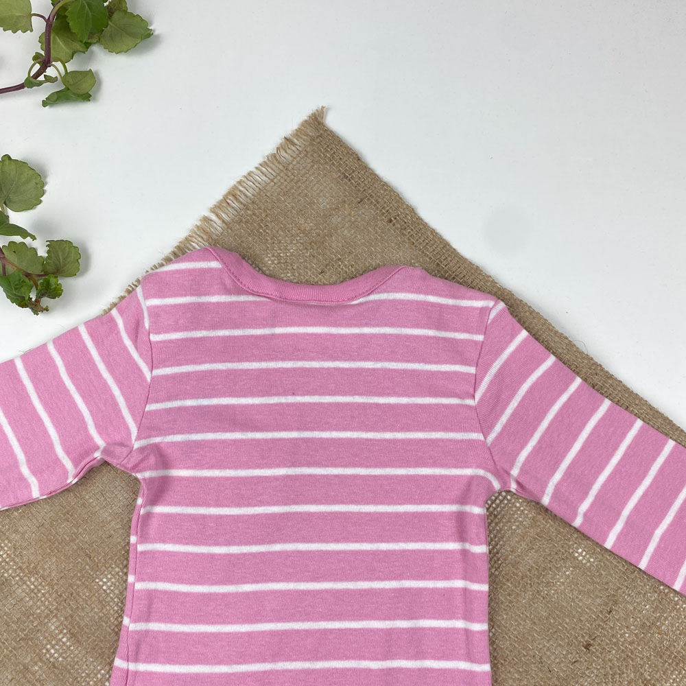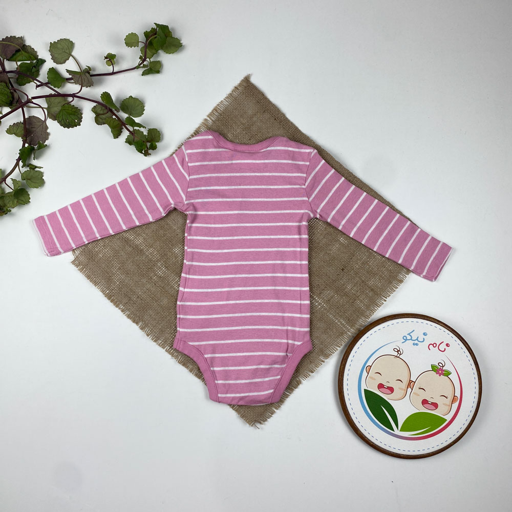 بادی نوزادی دخترانه آستین بلند طرح جوجه یقه گرد راه راه صورتی رنگ