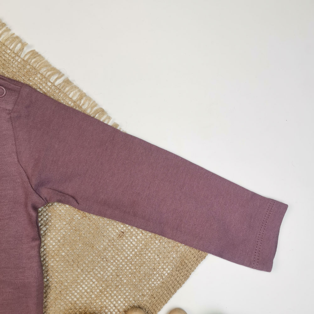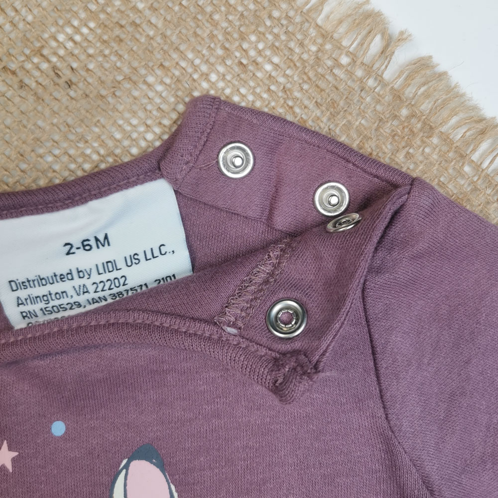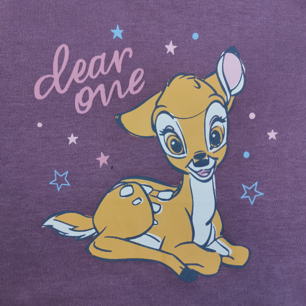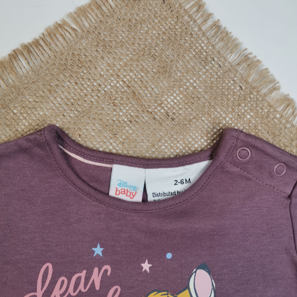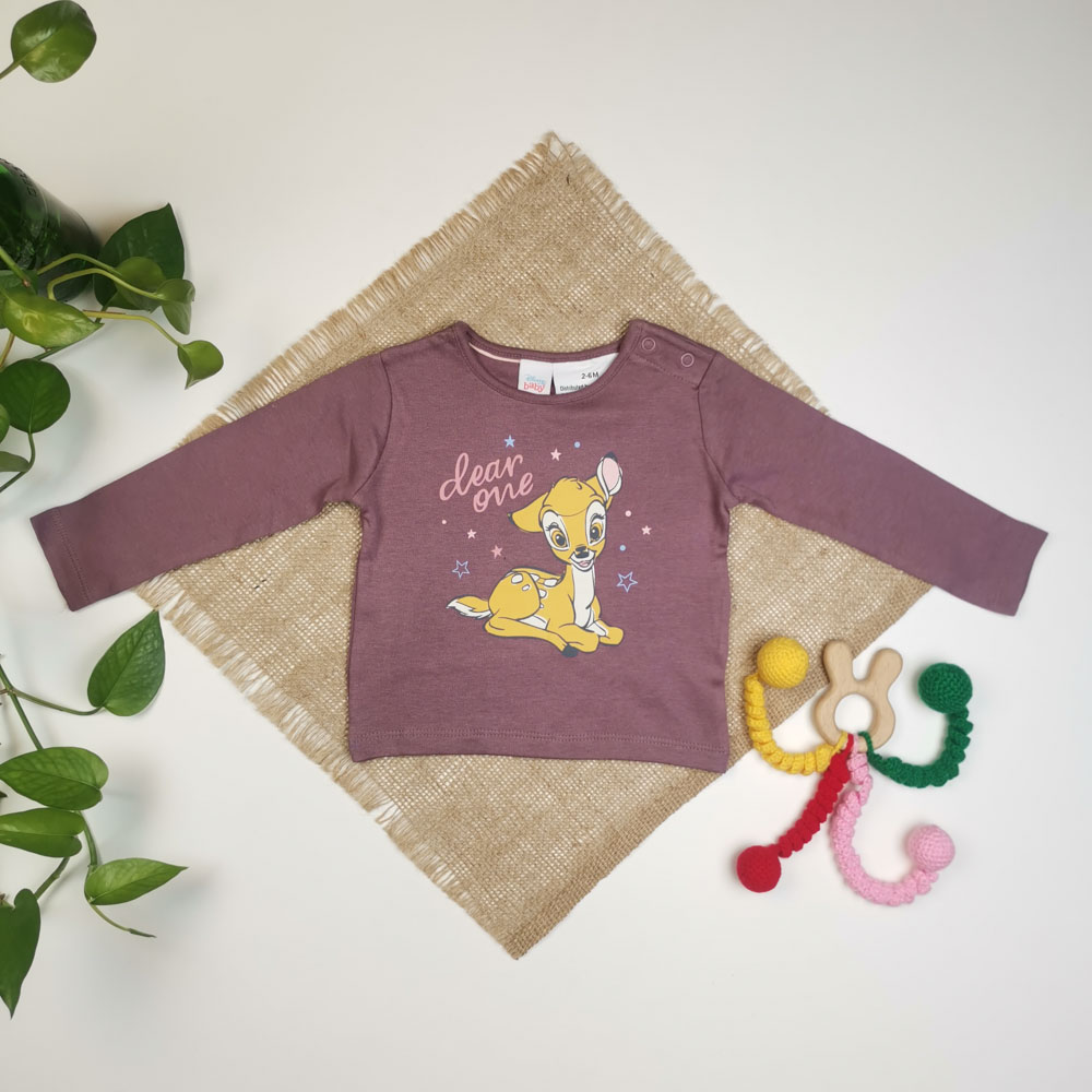 بلوز نوزادی دخترانه آستین بلند برند دیزنی طرح آهو سرشانه دکمه دار بادمجونی روشن رنگ – 2 تا 6 ماه