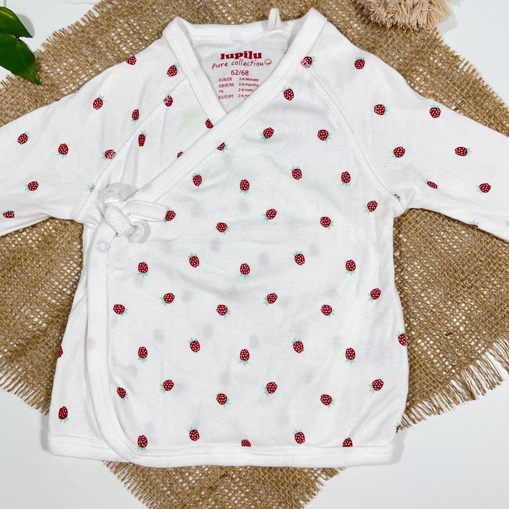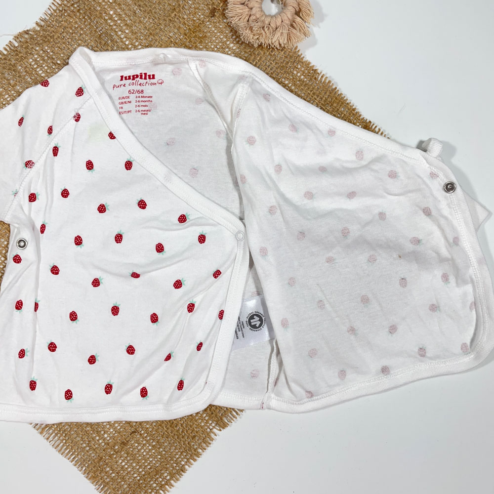 بلوز نوزادی دخترانه آستین بلند برند لوپیلو طرح روبدوشامی توت فرنگی سفید رنگ – 2 تا 6 ماه