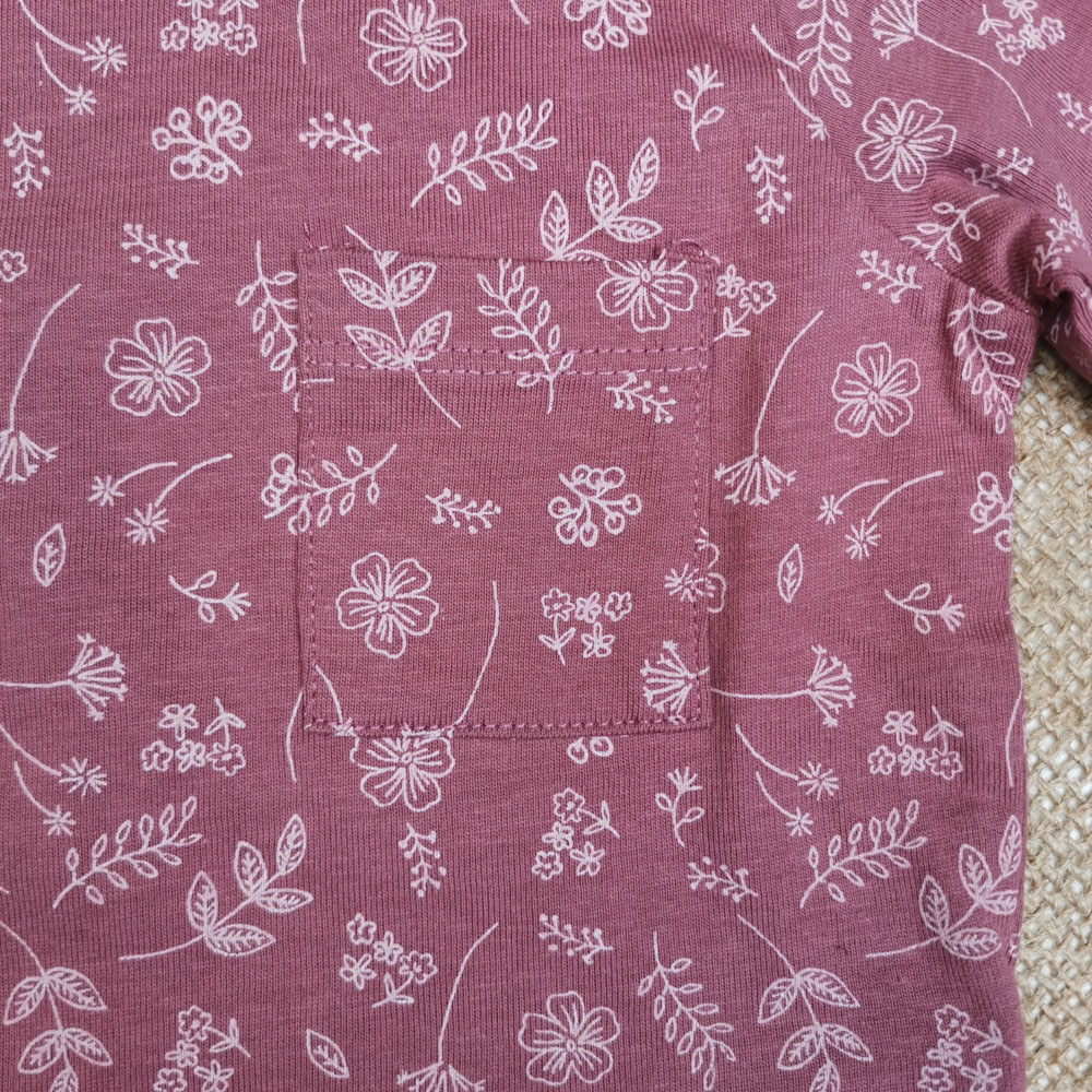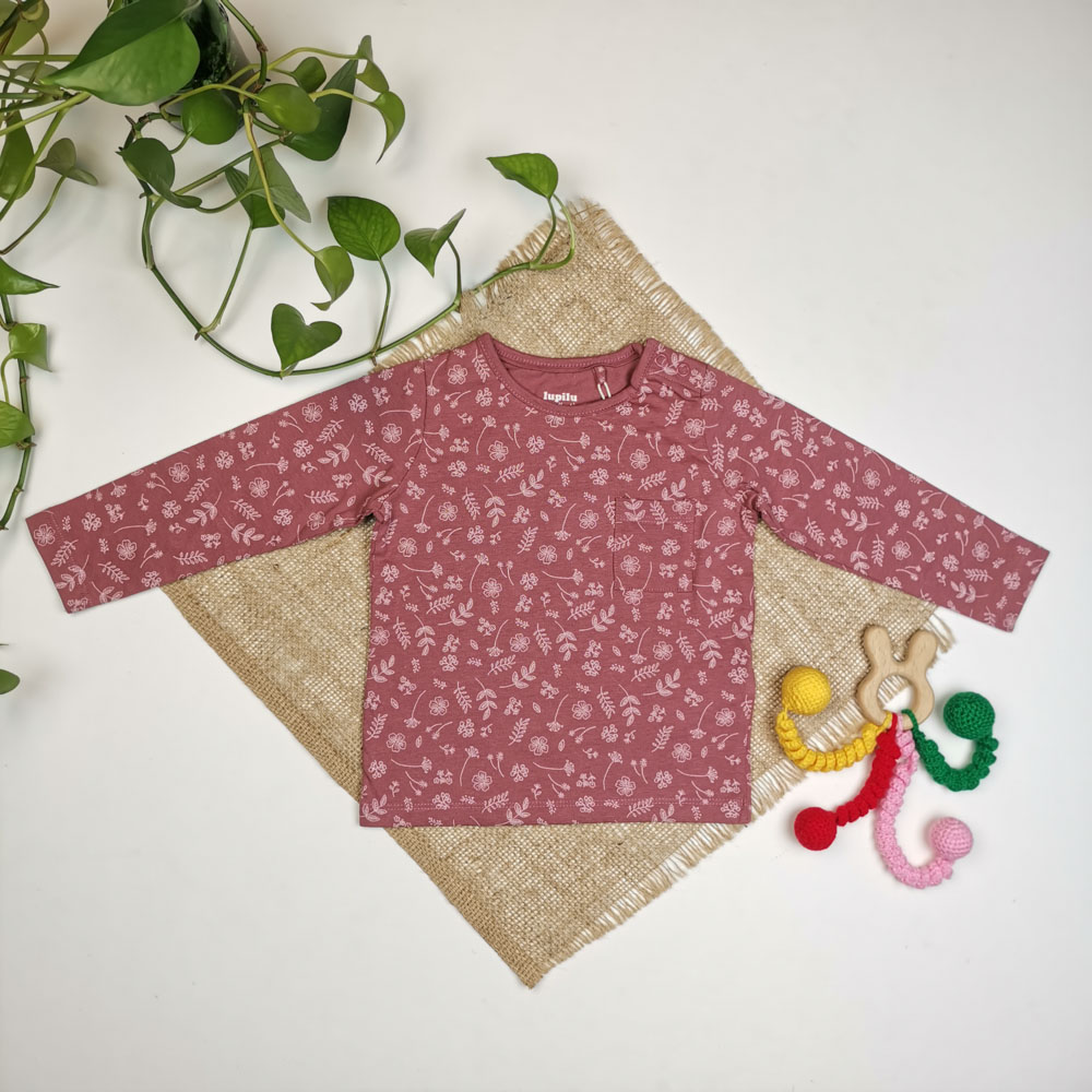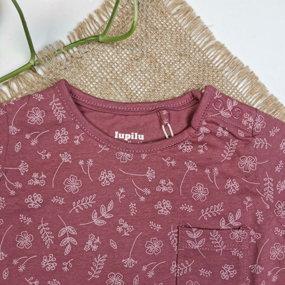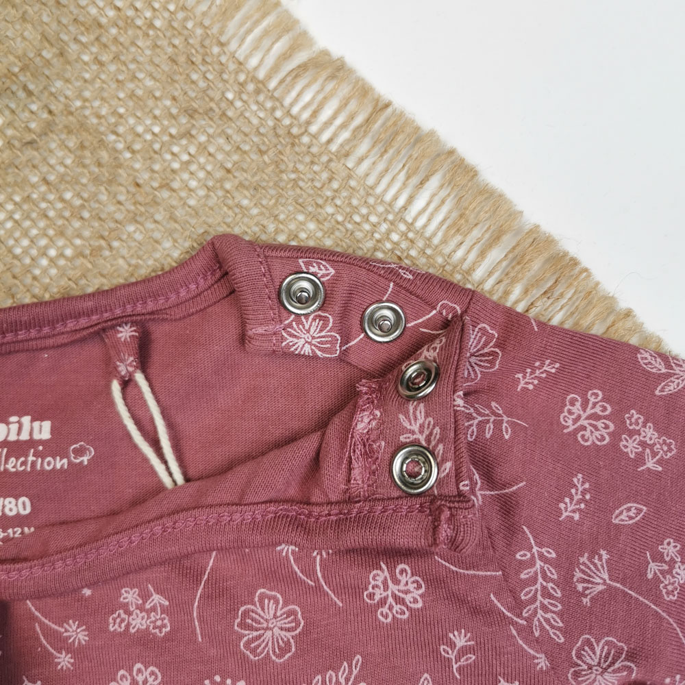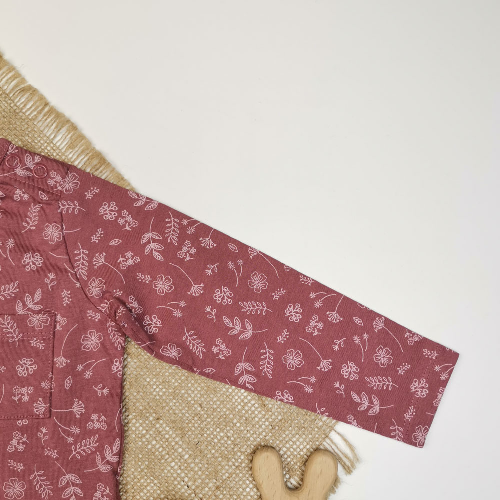 بلوز نوزادی دخترانه آستین بلند برند لوپیلو طرح برگ سرشانه دکمه دار کالباسی پررنگ