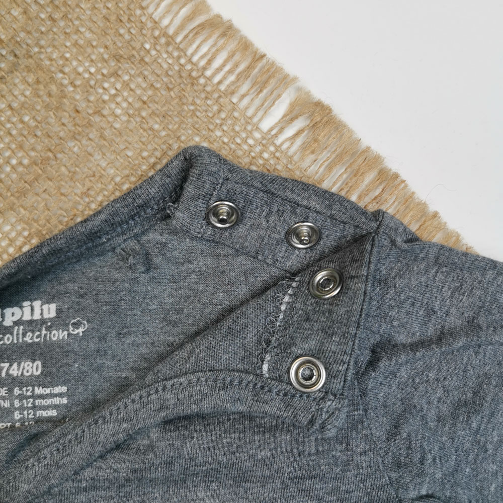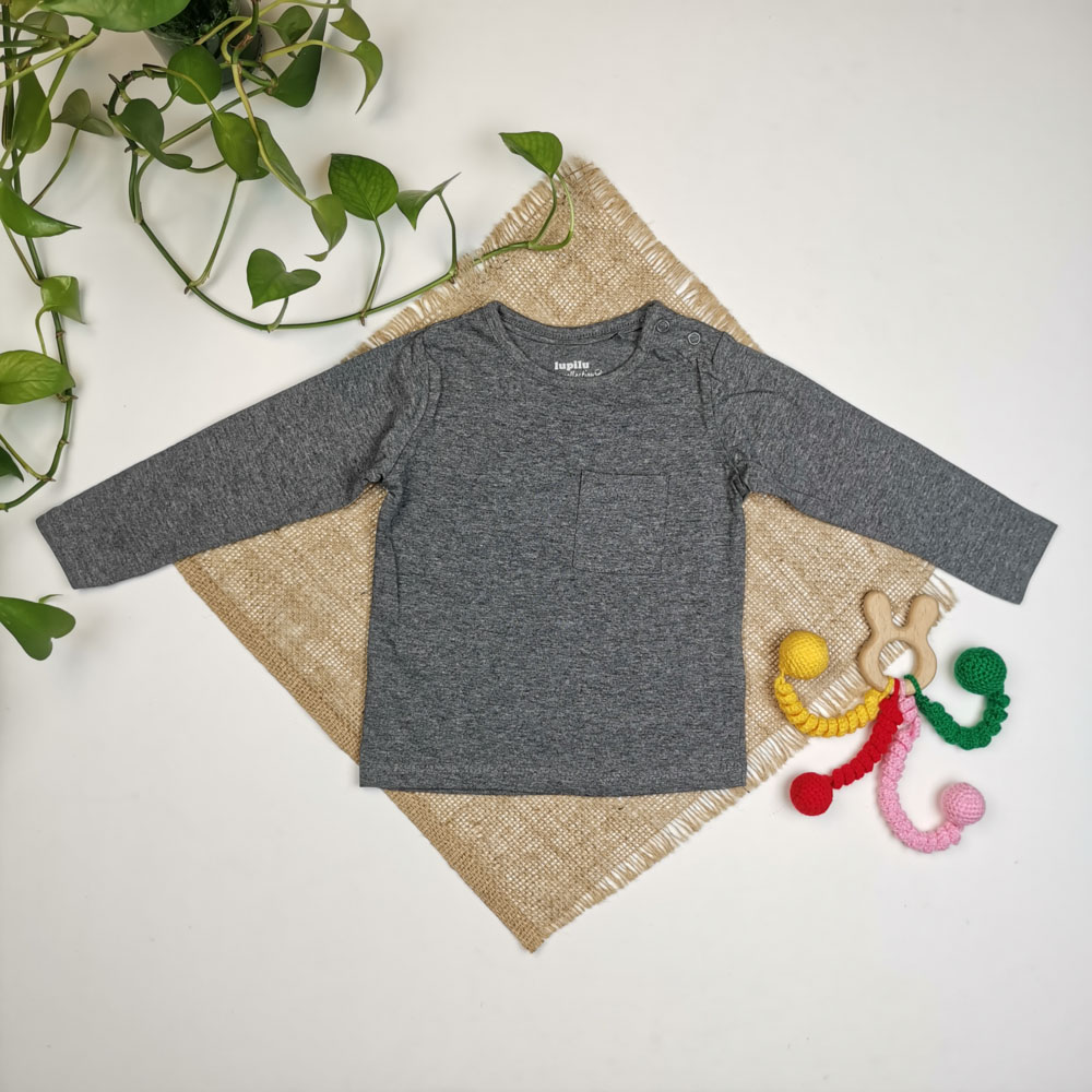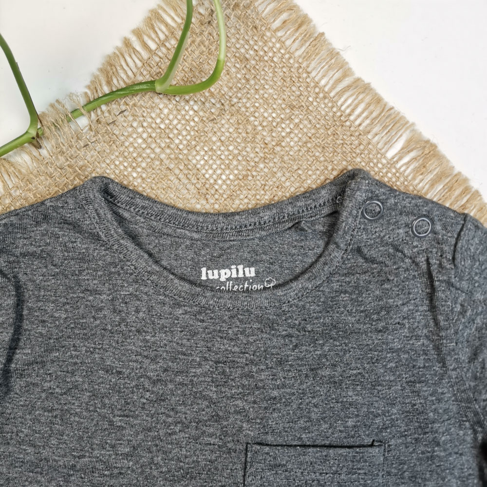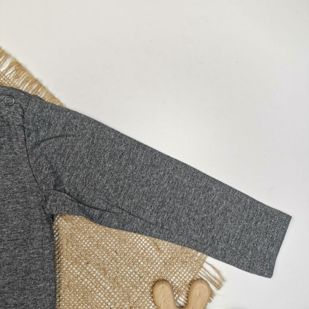 بلوز نوزادی پسرانه آستین بلند برند لوپیلو طرح جیب دار سرشانه دکمه دار طوسی تیره رنگ