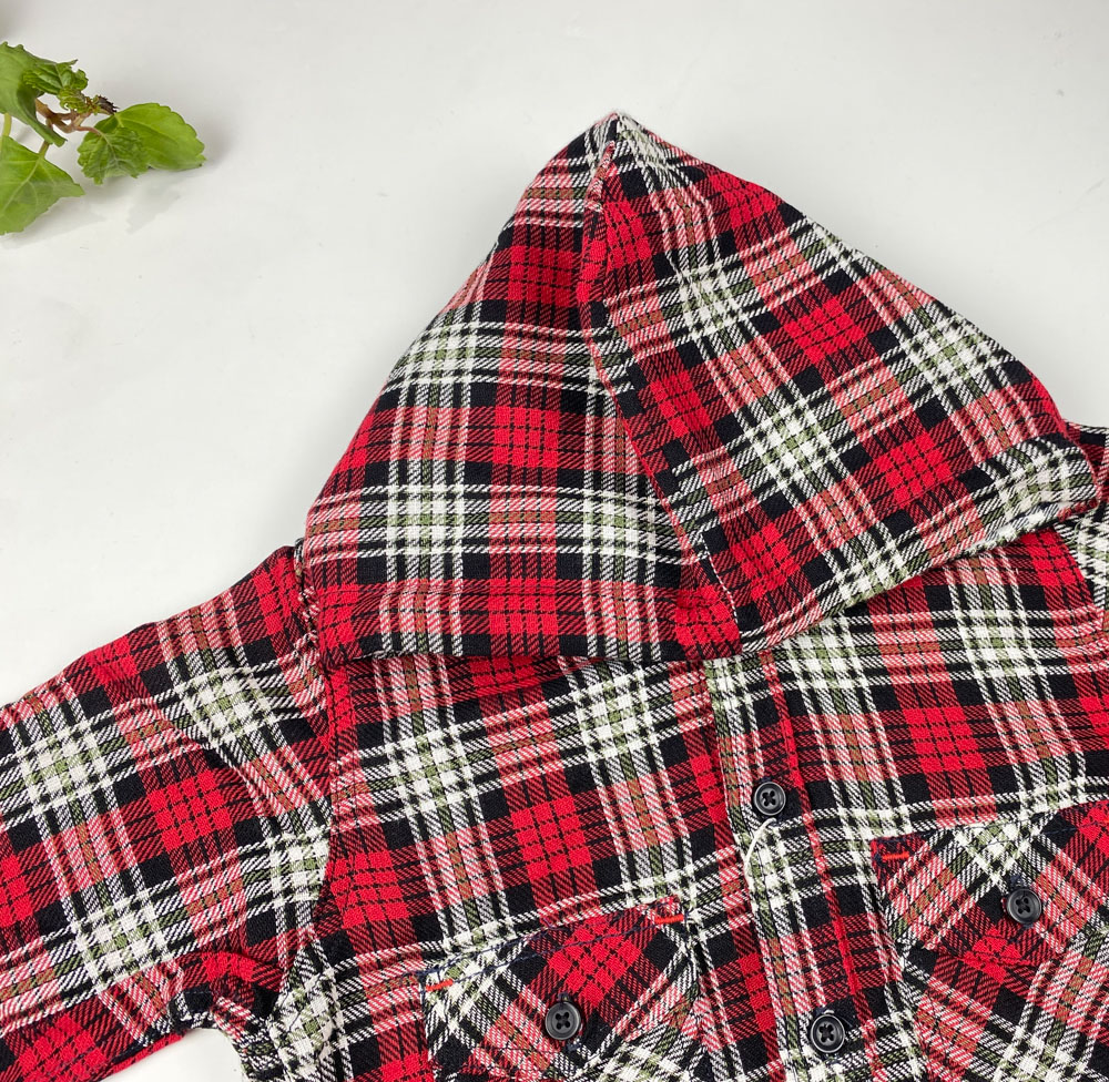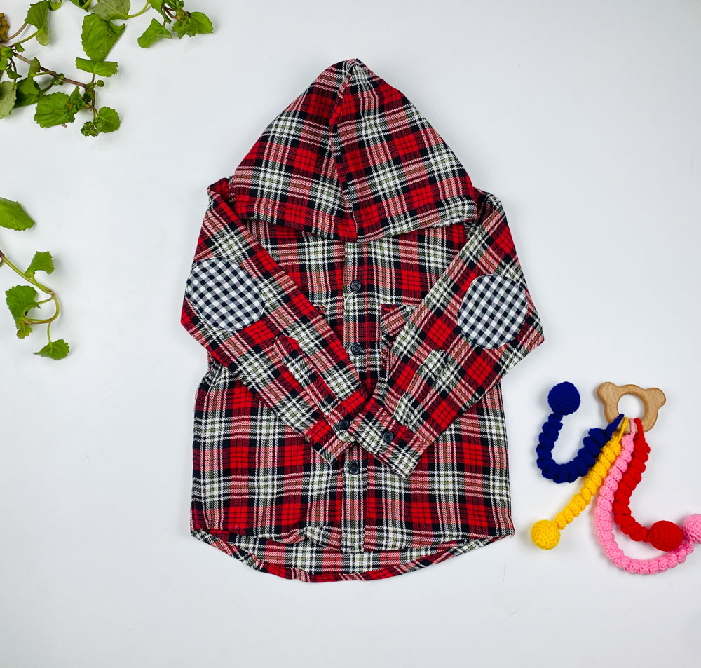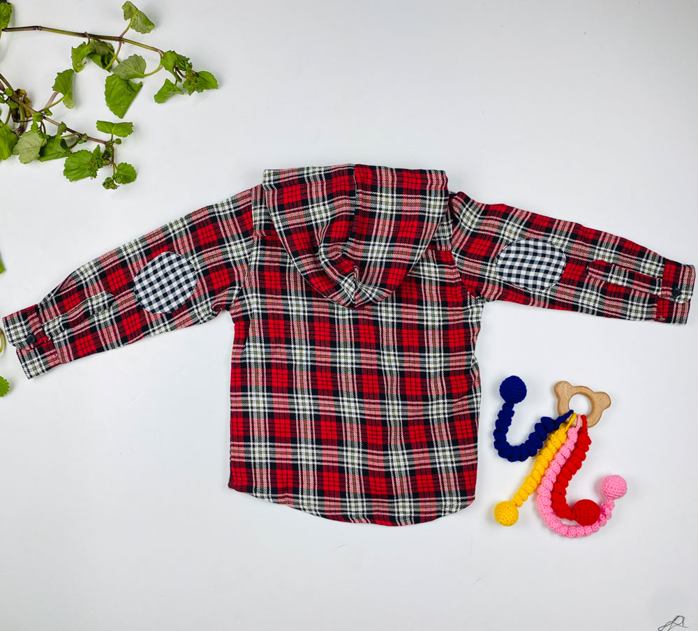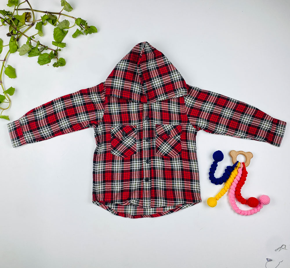 بلوز پسرانه آستین بلند طرح جیب دار چهارخونه کلاه دار قرمز رنگ