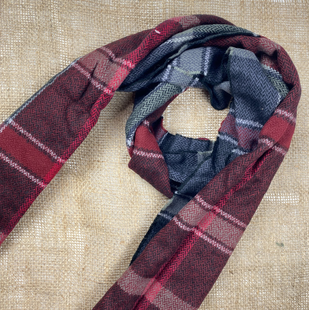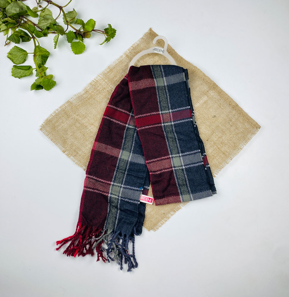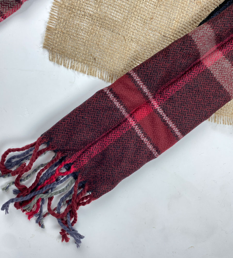 تخفیف یلدایی _ شال گردن طرح چهارخونه ریش ریش زرشکی رنگ – فری سایز