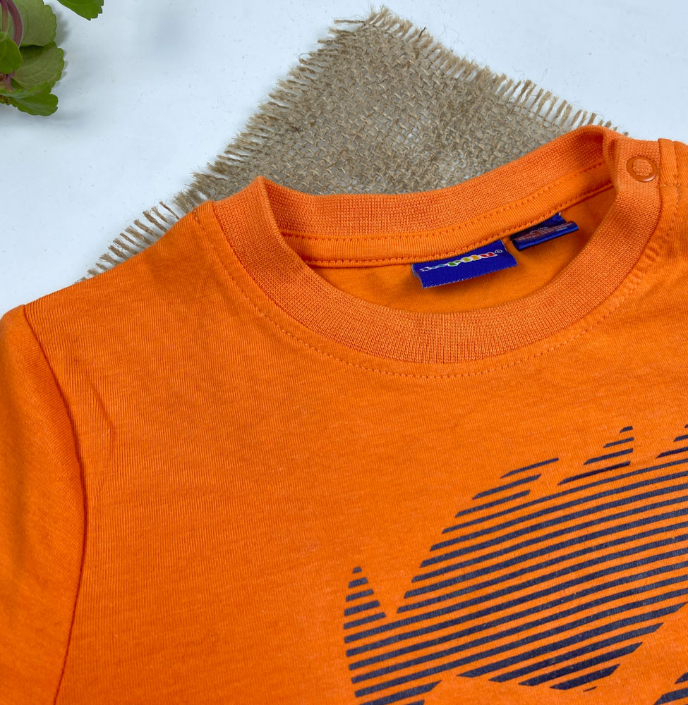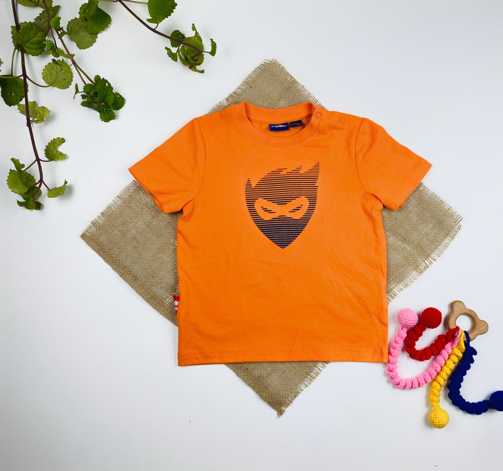 تیشرت نوزادی آستین کوتاه برند لوپیلو طرح یقه گرددکمه دار صورت عینک دار نارنجی رنگ – 12 تا 24 ماه