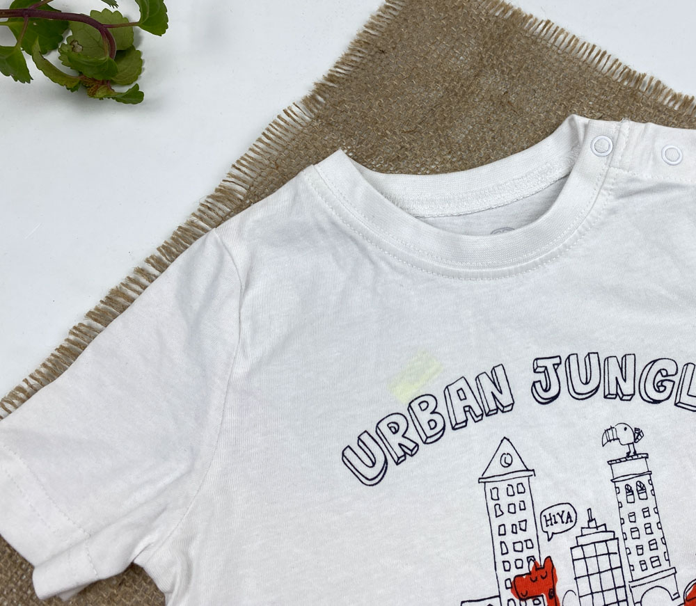 تیشرت نوزادی آستین کوتاه برند لوپیلو طرح یقه گرد دکمه دار جنگل و حیوانات سفید رنگ – 12 تا 24 ماه