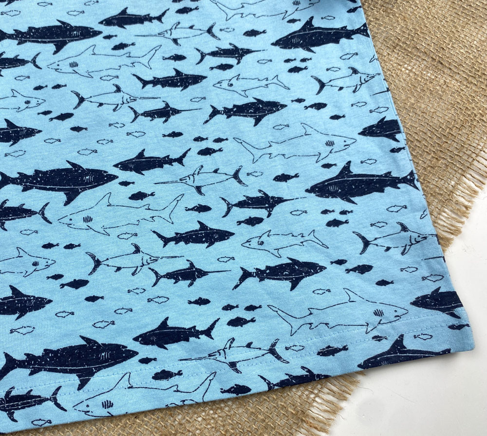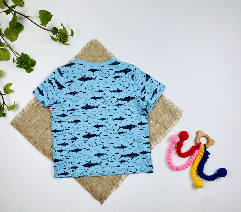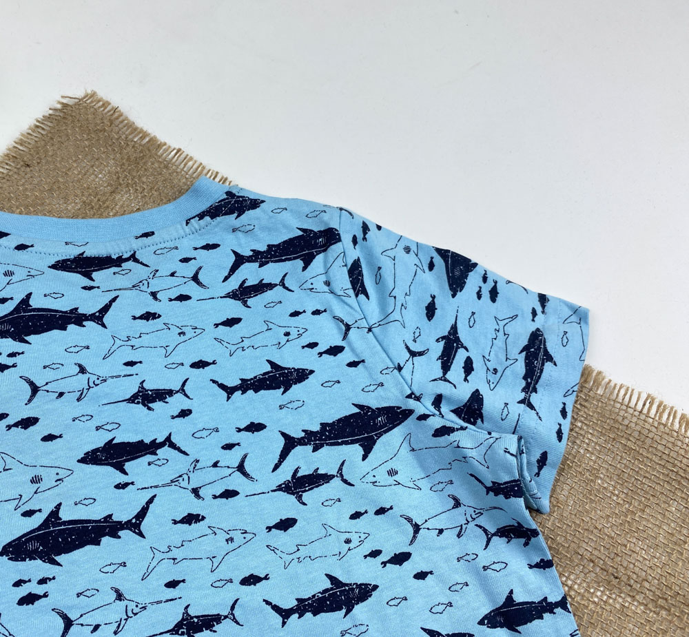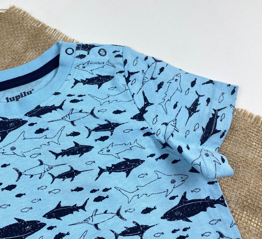 تیشرت نوزادی آستین کوتاه برند لوپیلو طرح یقه گرد دکمه دار ماهی ها آبی آسمانی رنگ – 12 تا 24 ماه