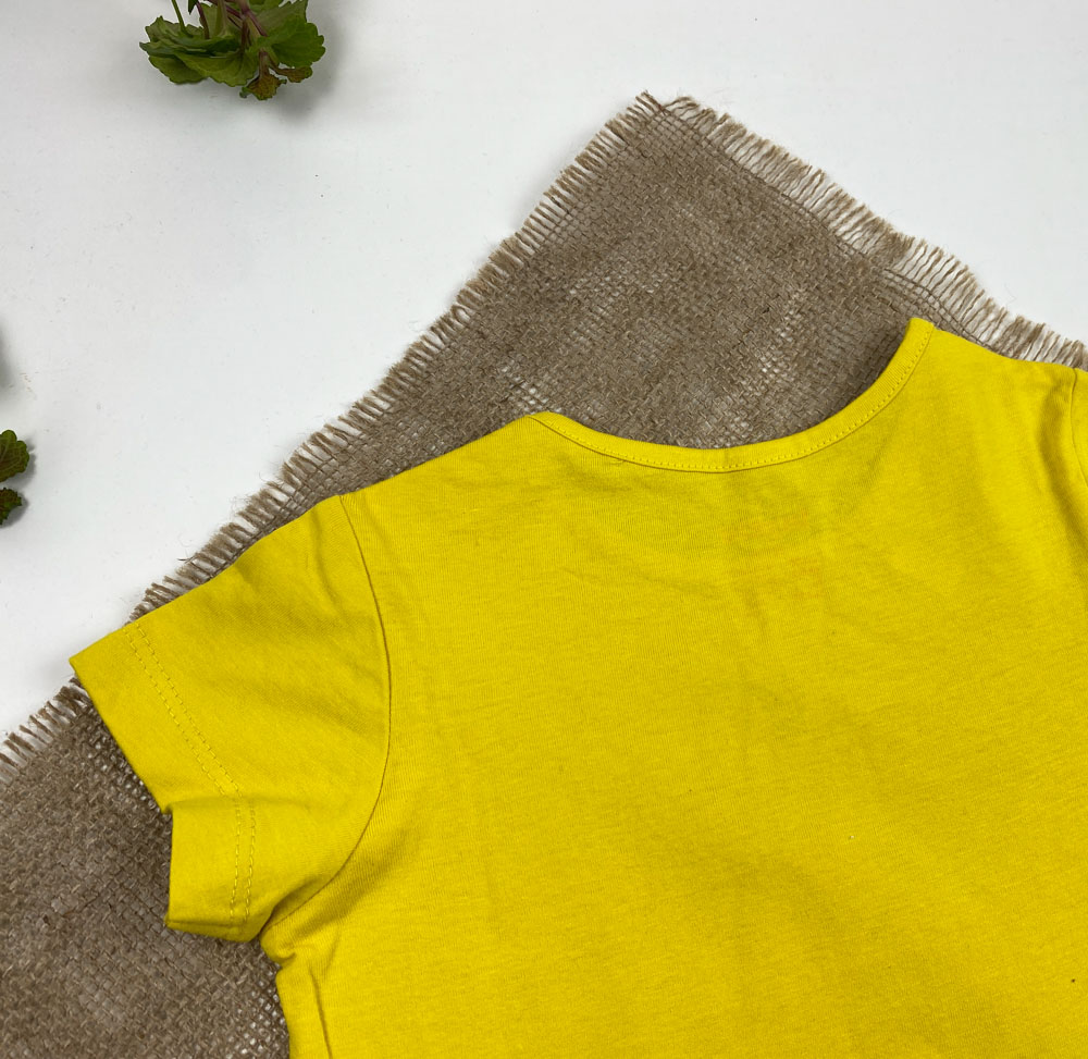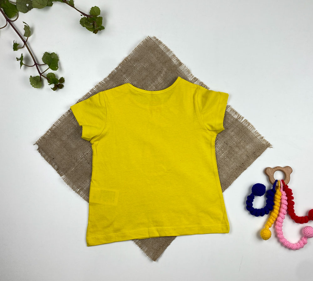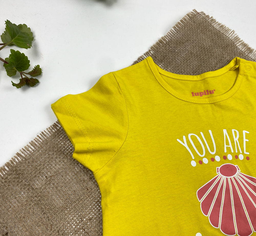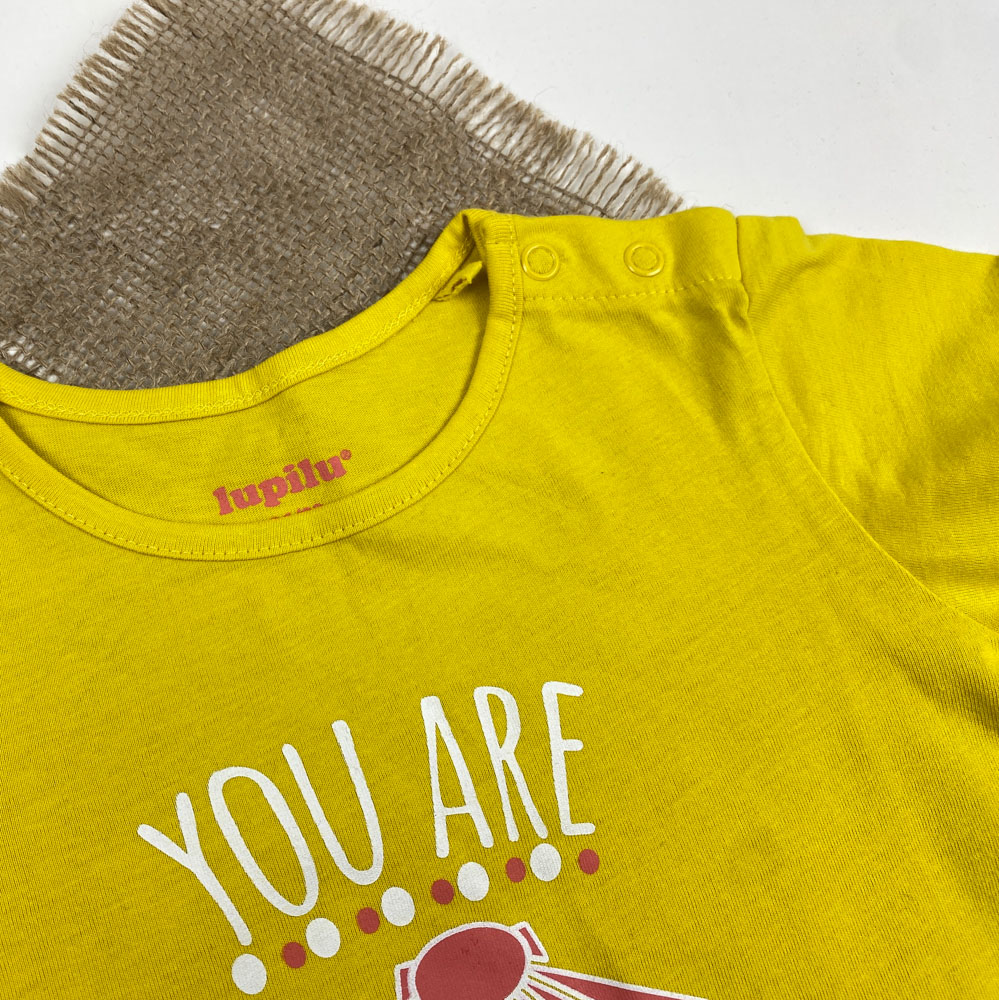 تیشرت نوزادی دخترانه آستین کوتاه برند لوپیلو طرح یقه گرد دکمه دار متن لاتین گل زرد رنگ – 12 تا 24 ماه