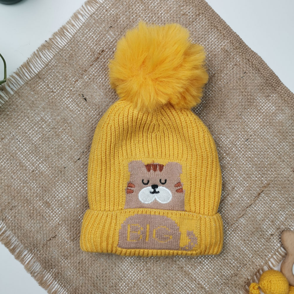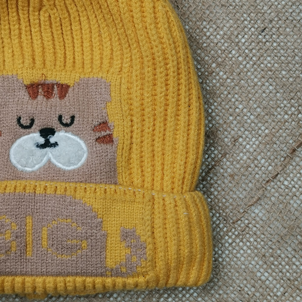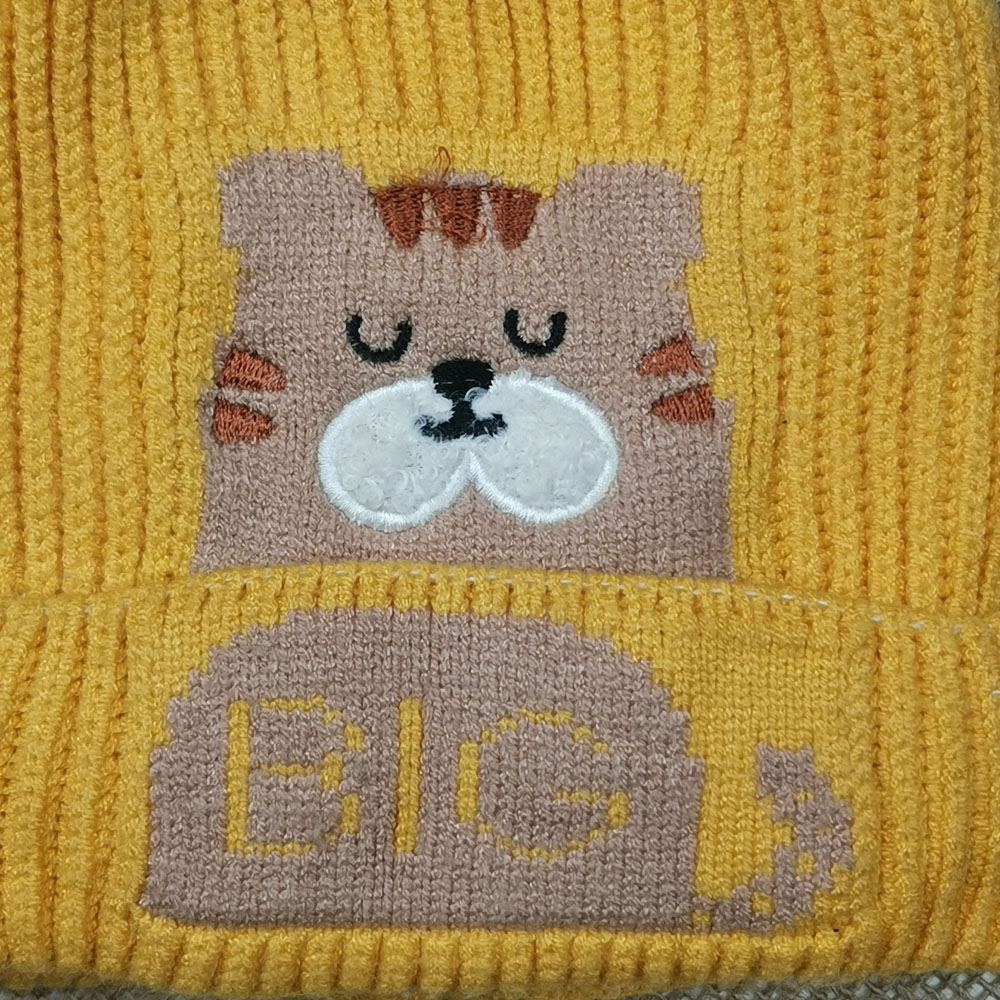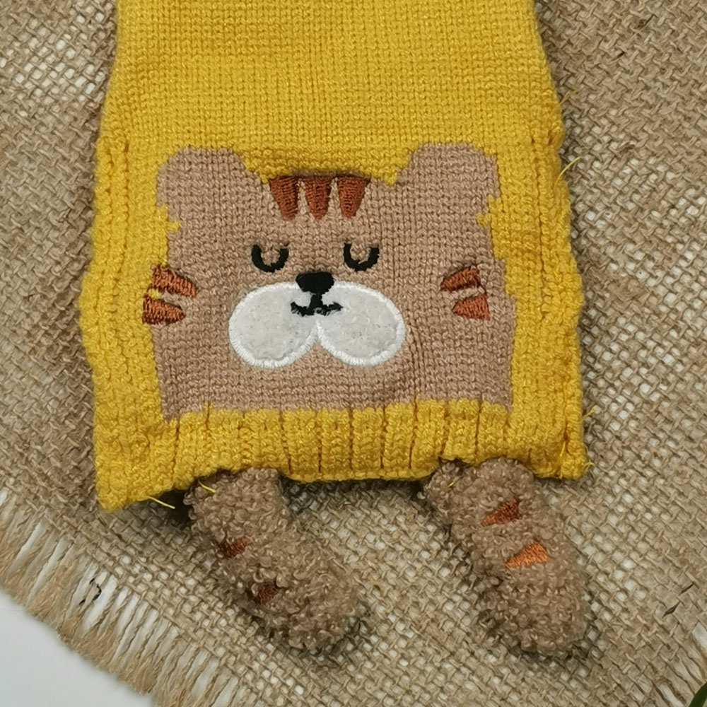 ست کلاه و شال بافت پسرانه طرح گربه آستردار پشمی خردلی رنگ – 4 تا 6 سال
