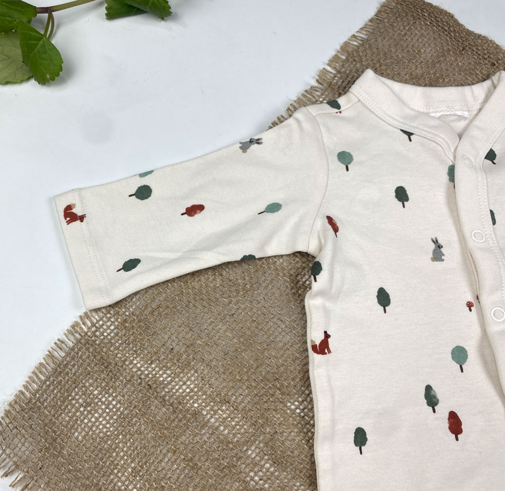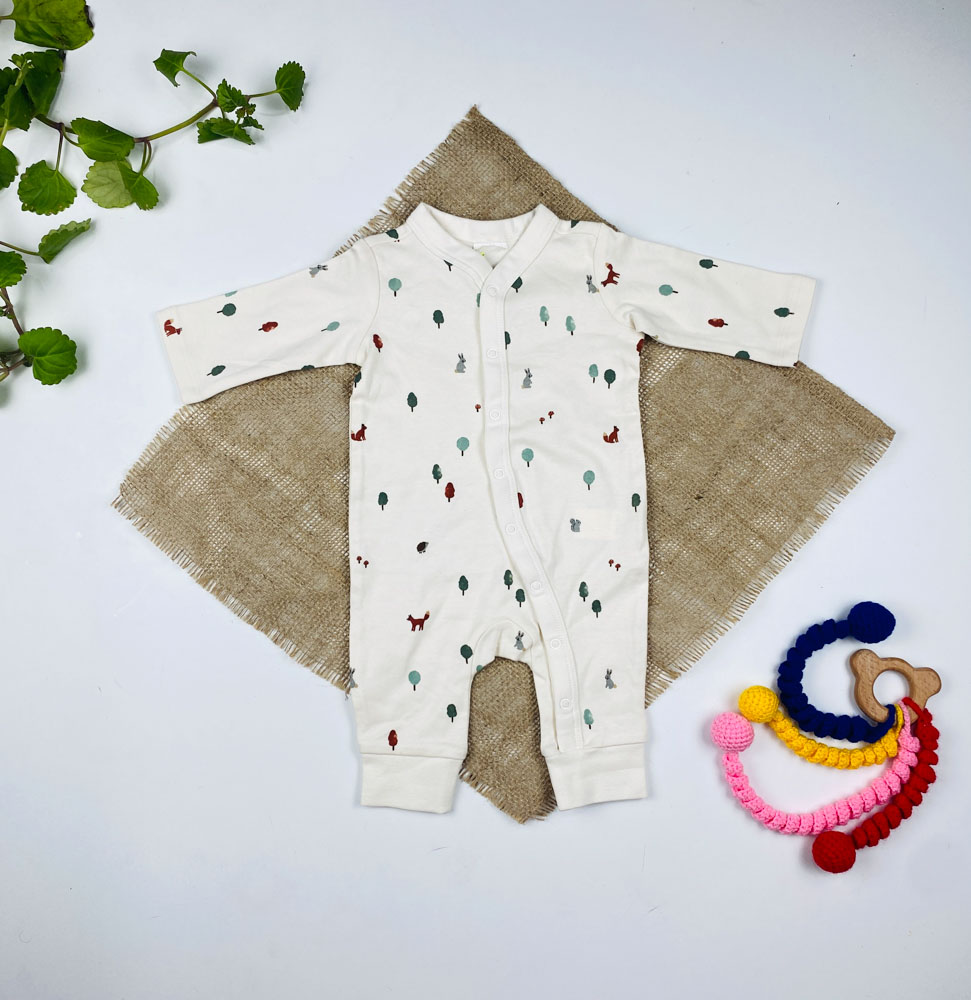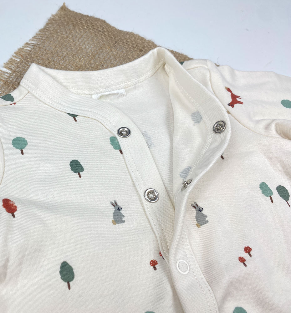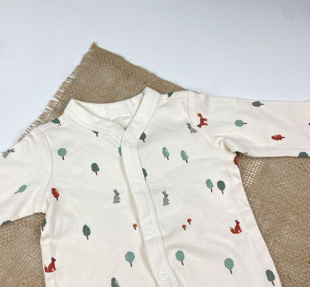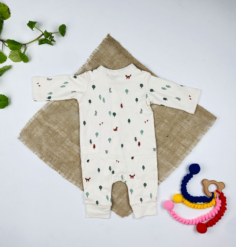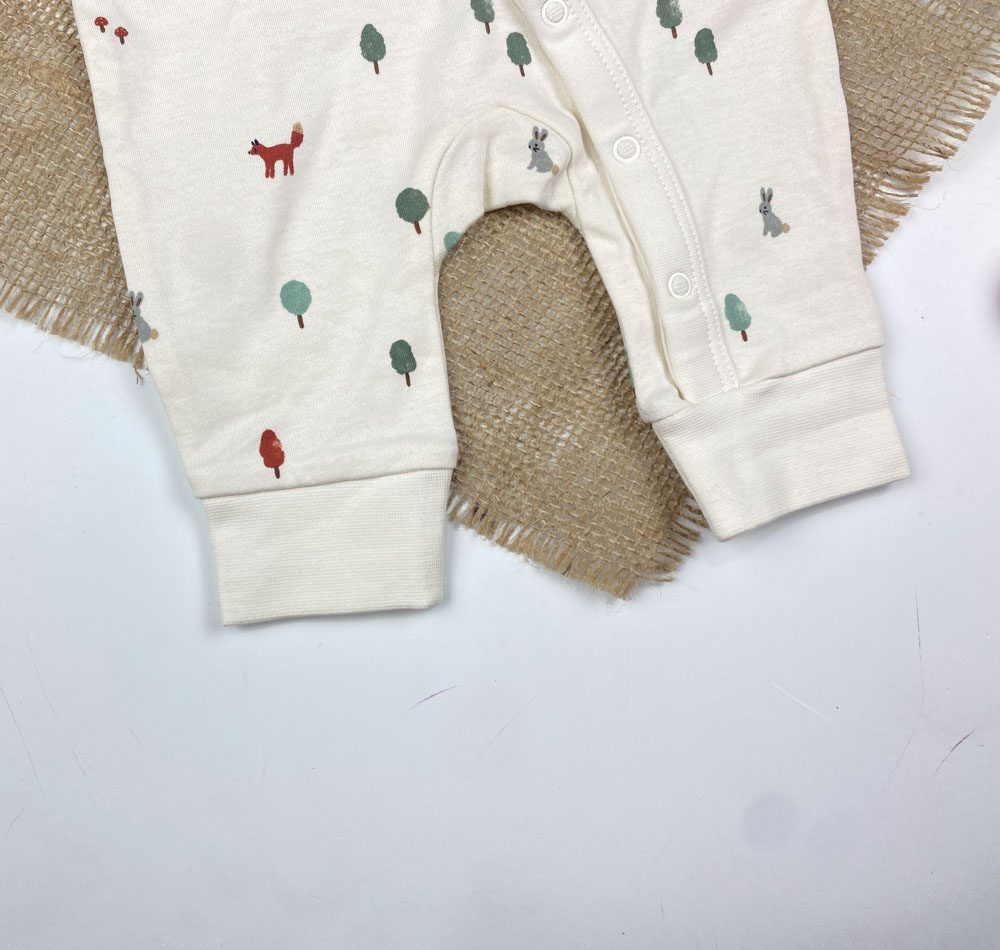 سرهمی نوزادی آستین بلند طرح درخت و خرگوش جلو دکمه ای بدون جوراب شیری رنگ