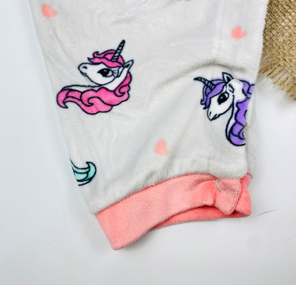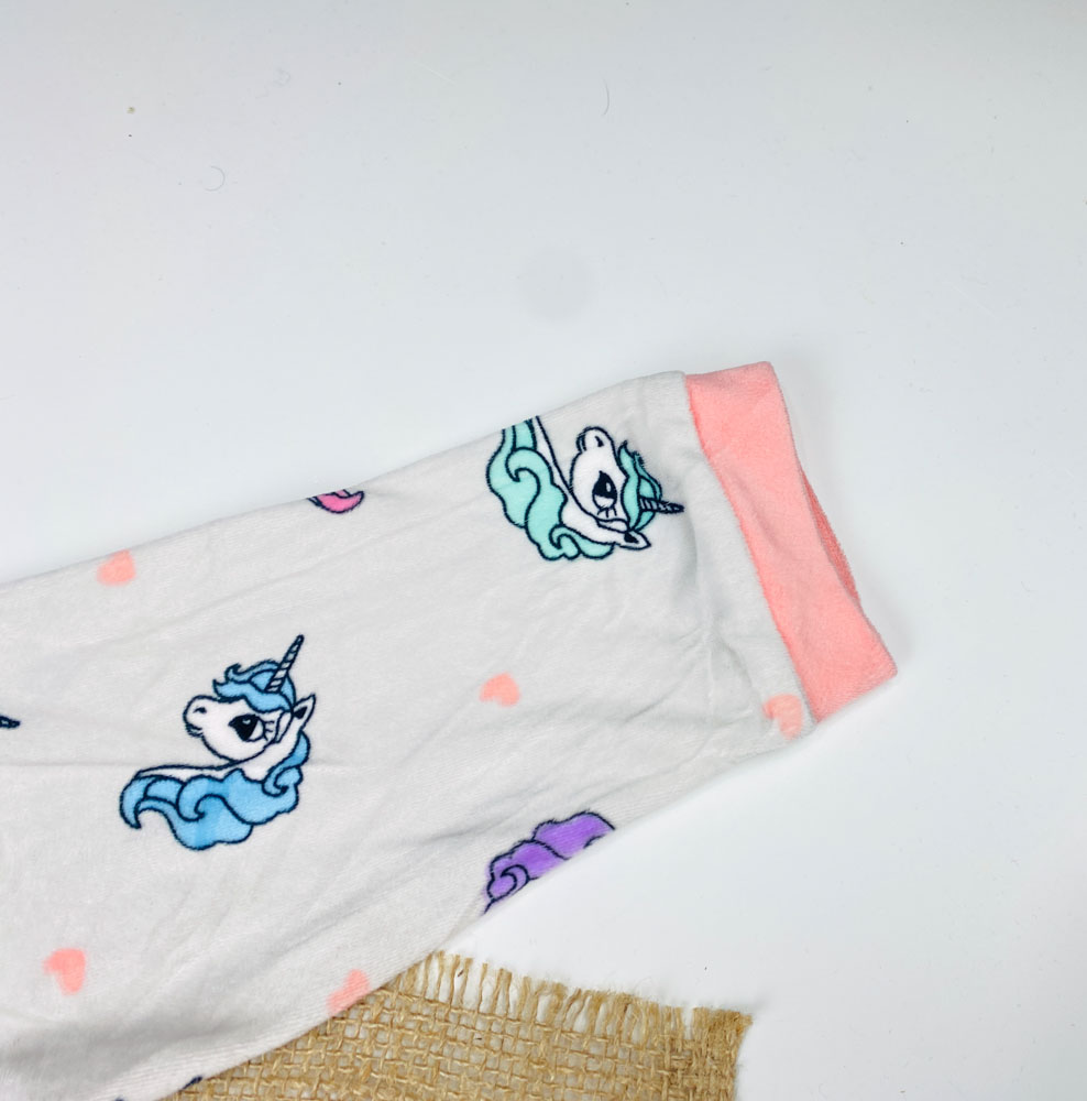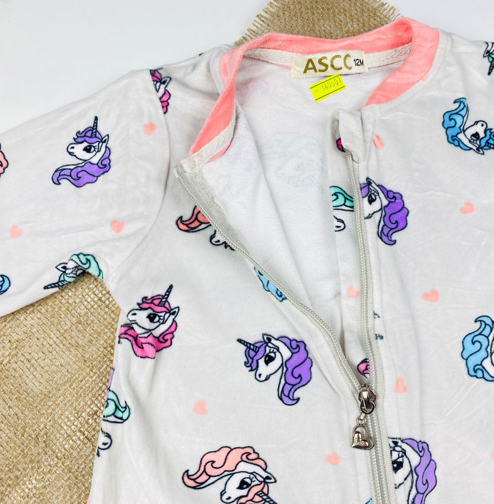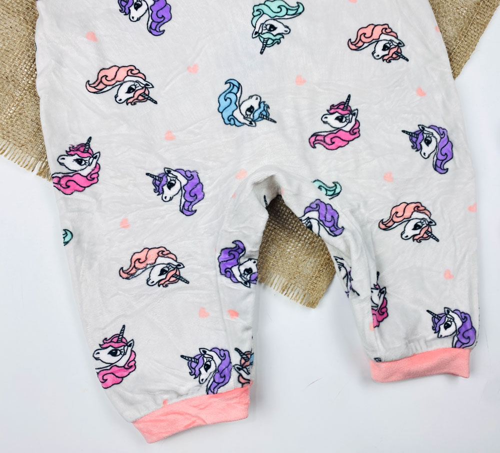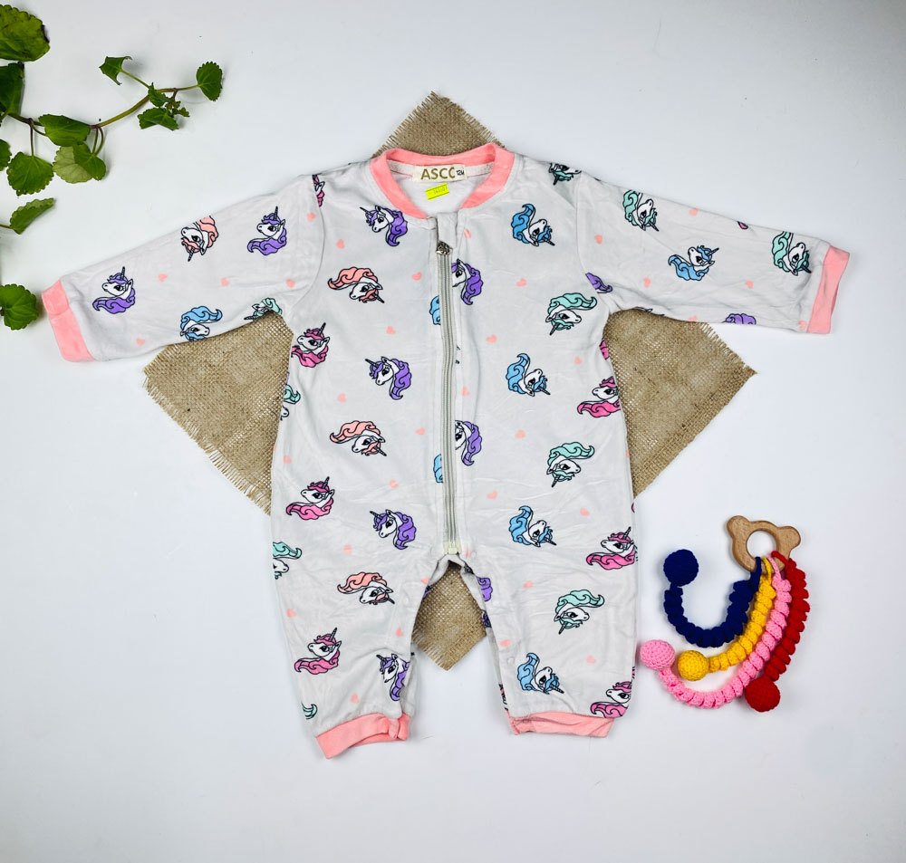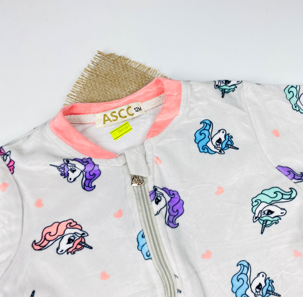 سرهمی نوزادی دخترانه آستین بلند طرح یونیکورن جلو زیپ دار بدون جوراب سفید رنگ – 12 ماه