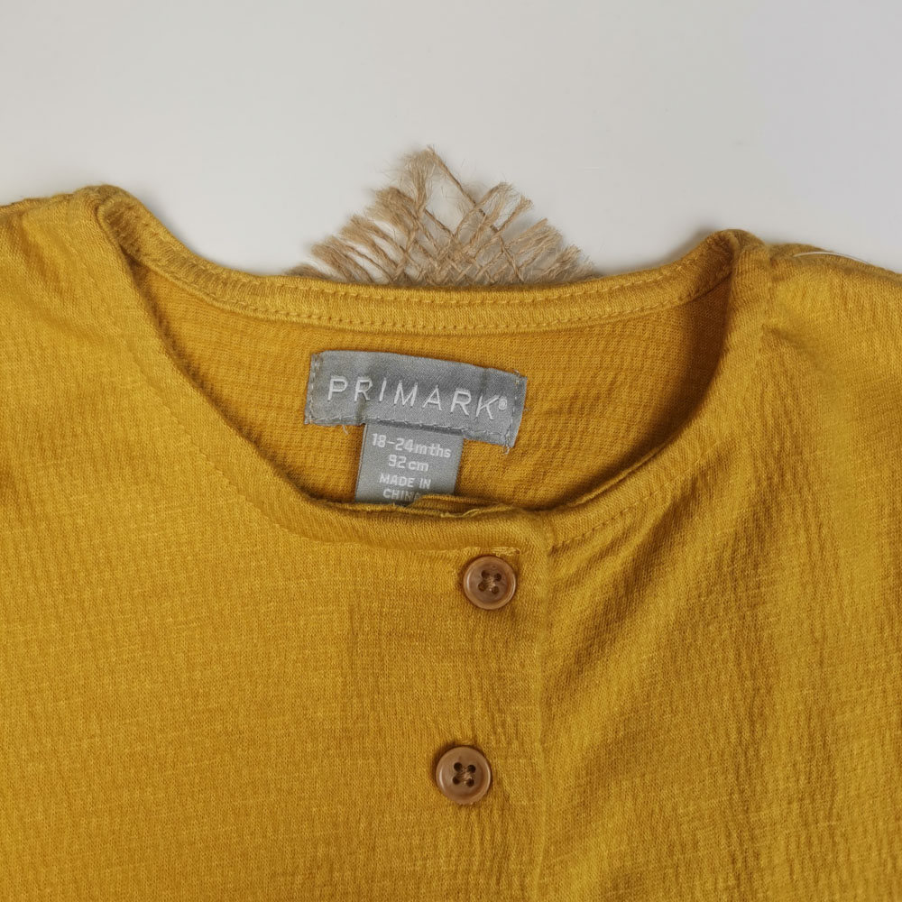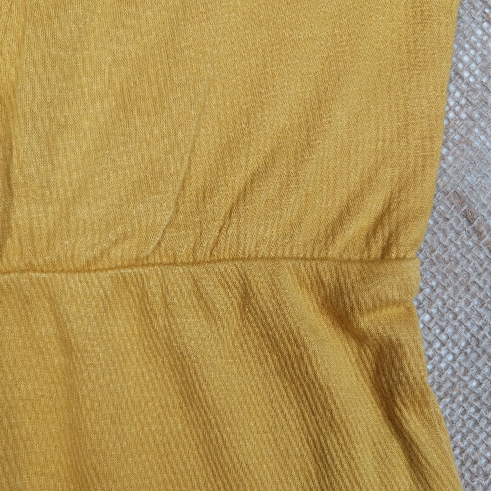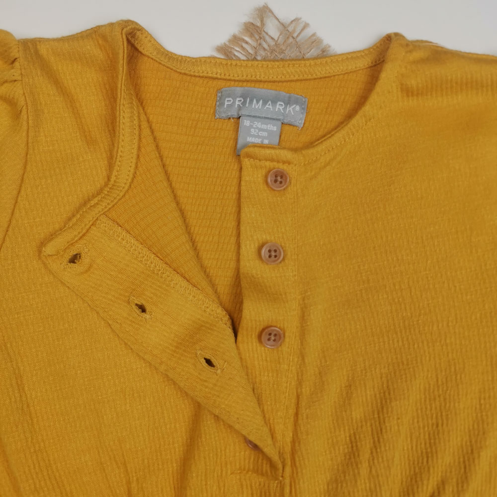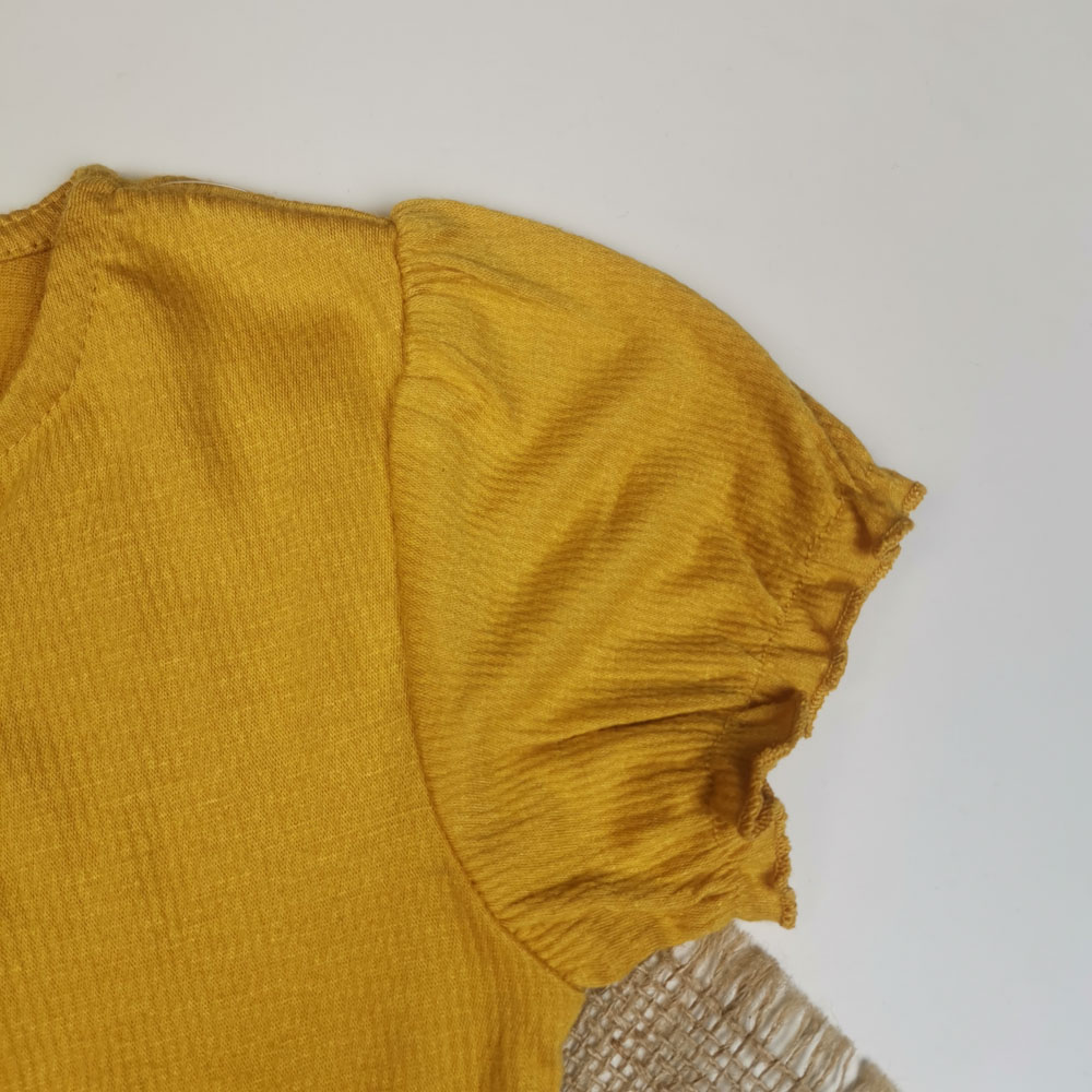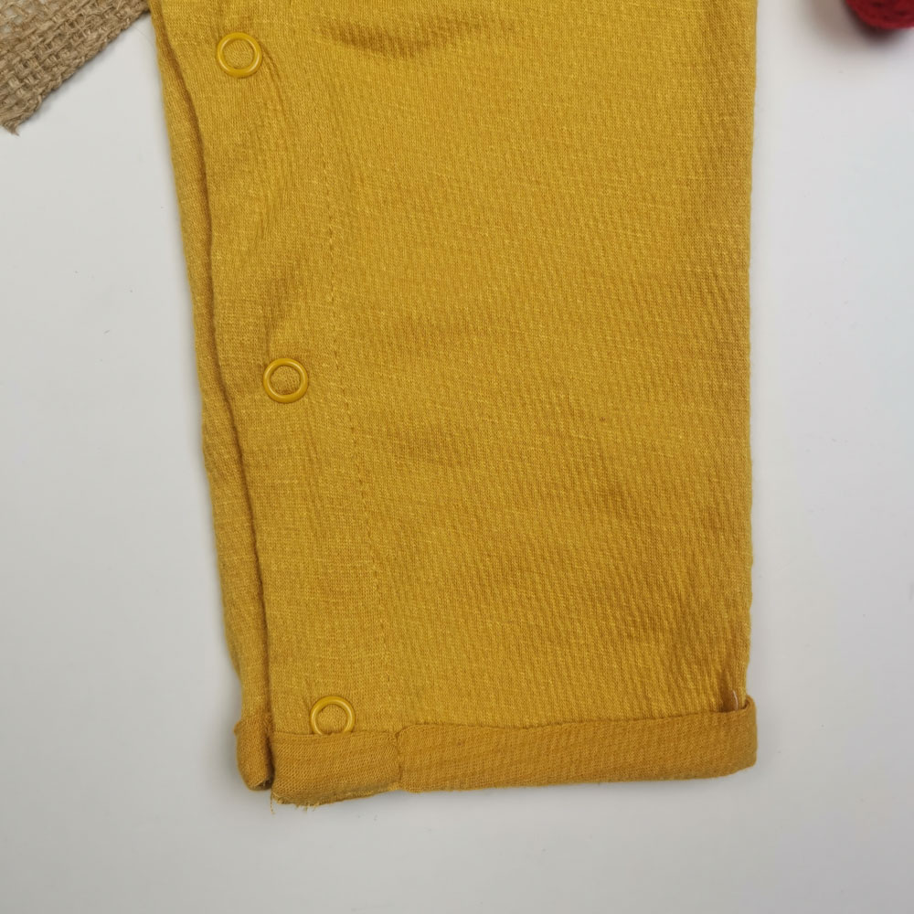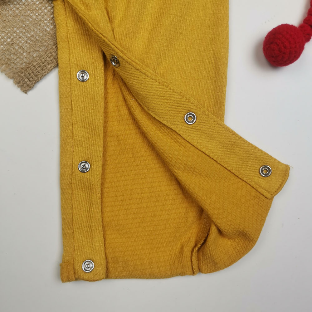 سرهمی نوزادی دخترانه آستین کوتاه طرح دکمه دار پرک پرکی خردلی روشن رنگ