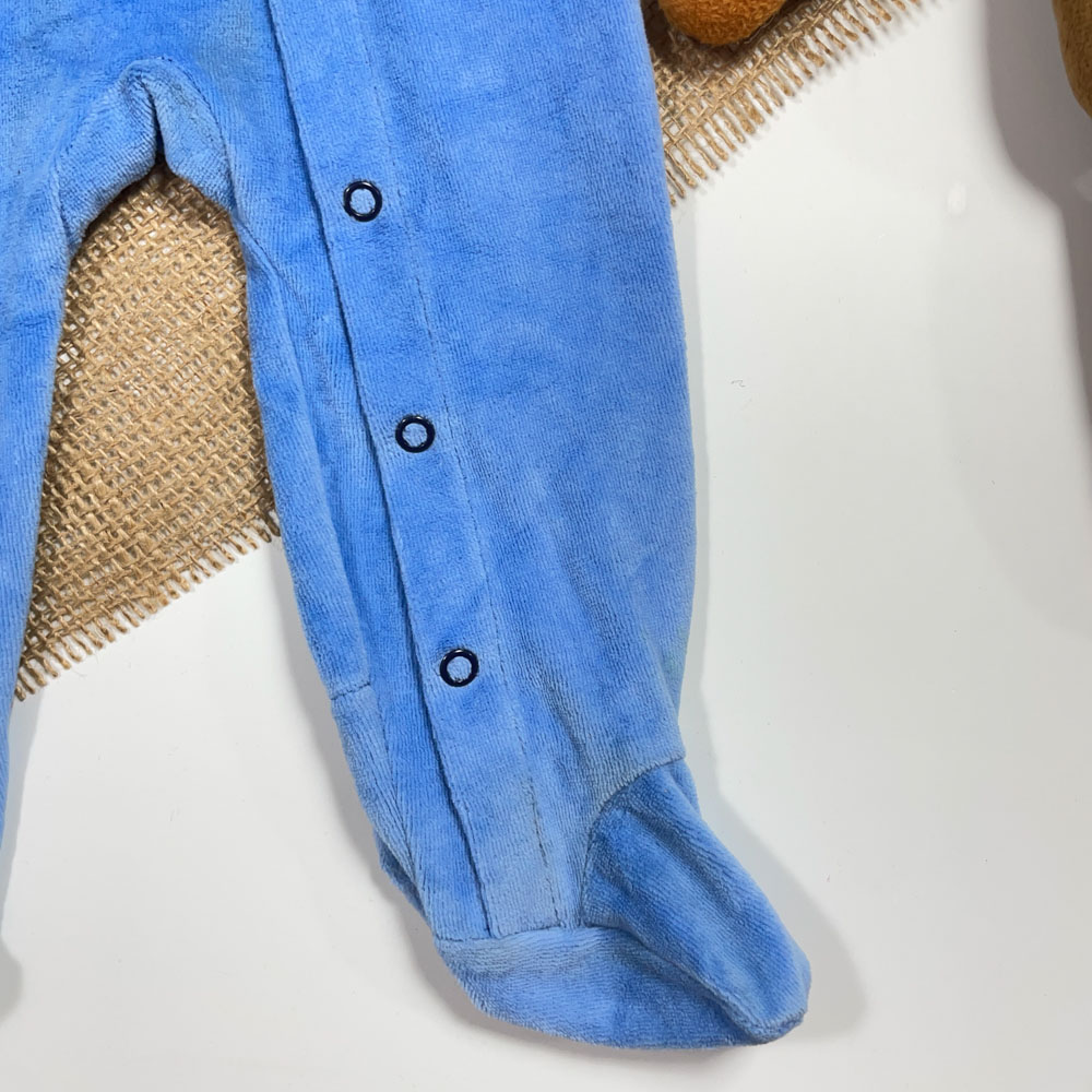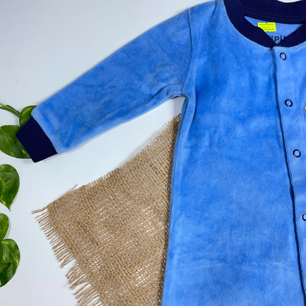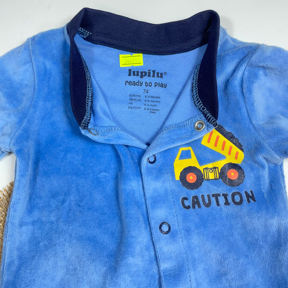 سرهمی نوزادی پسرانه آستین بلند برند Iupilu طرح ماشین ابی رنگ – 12 ماه