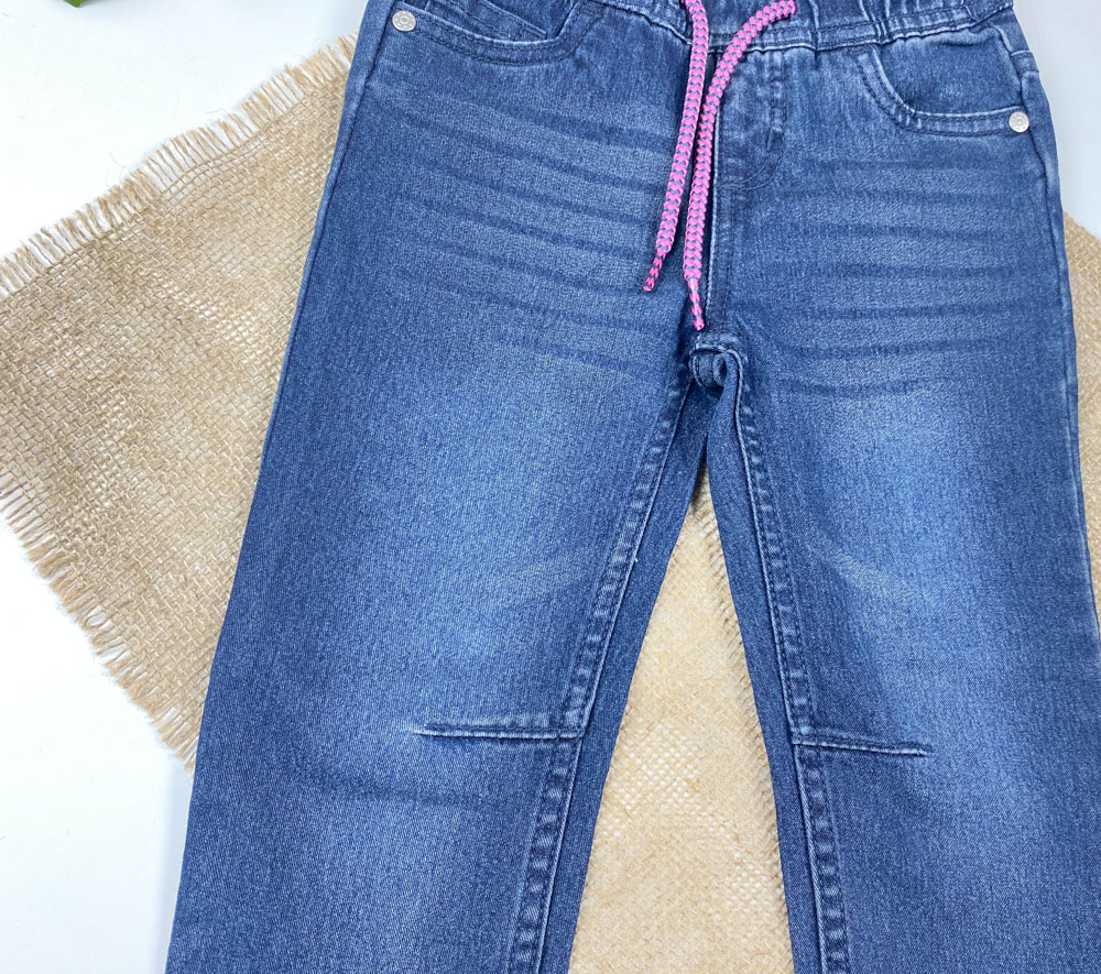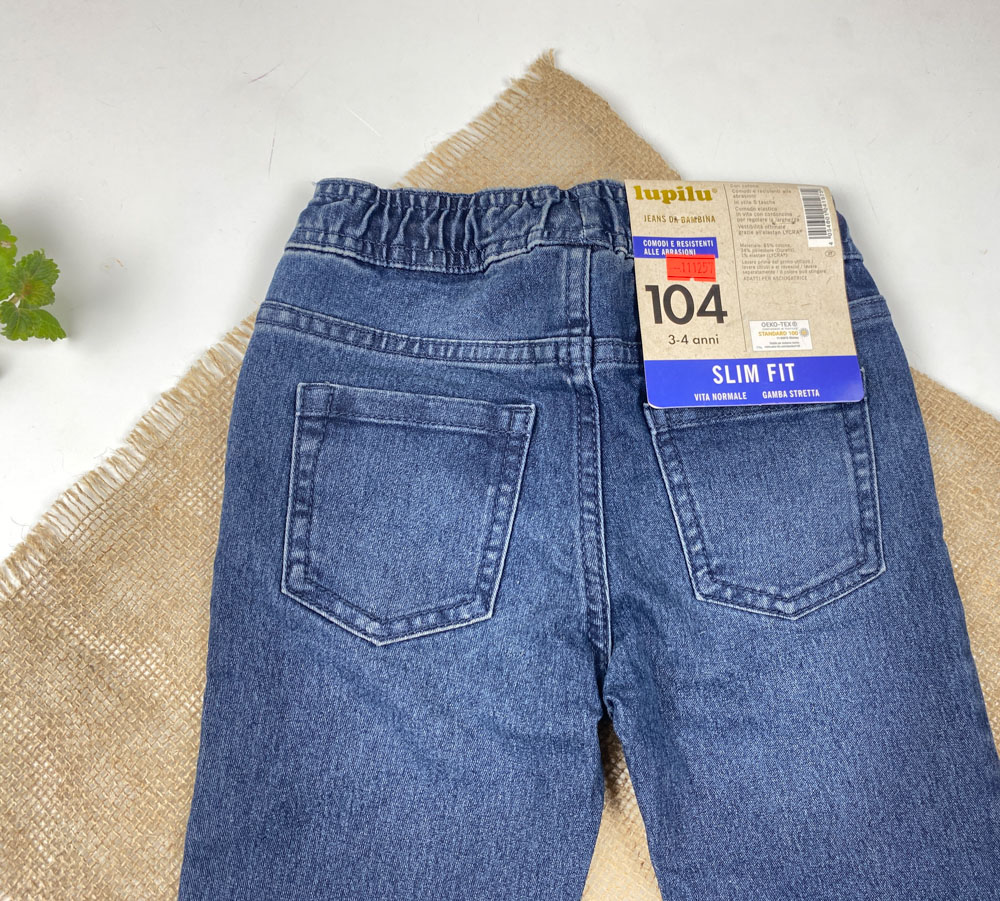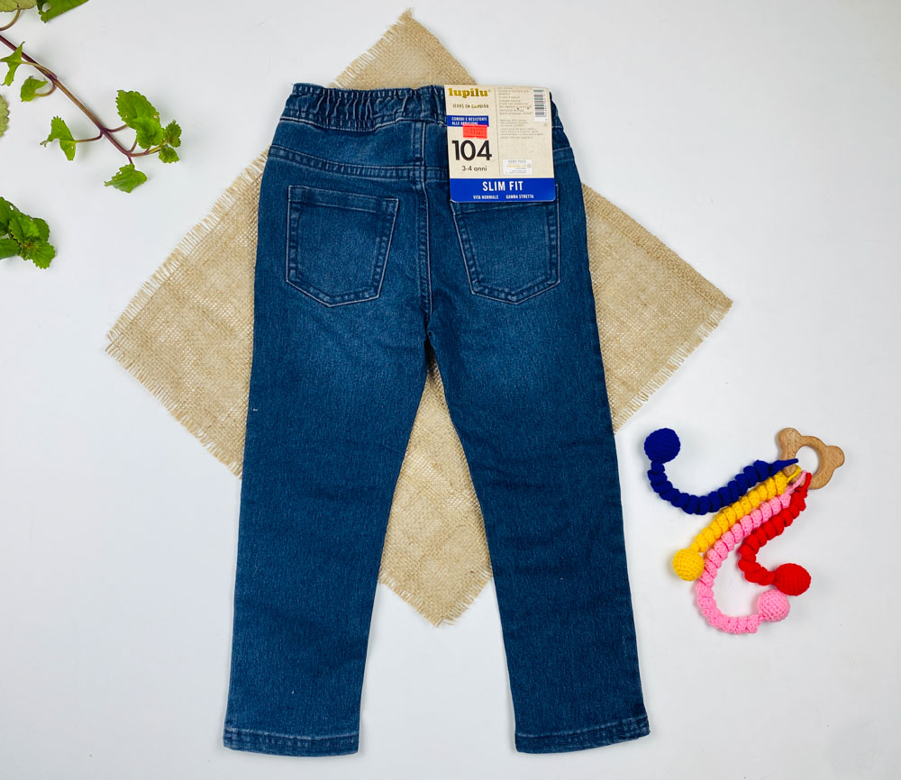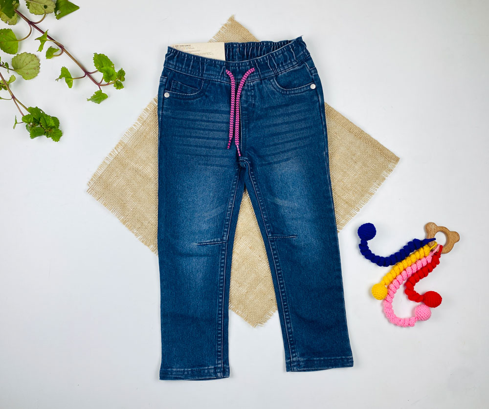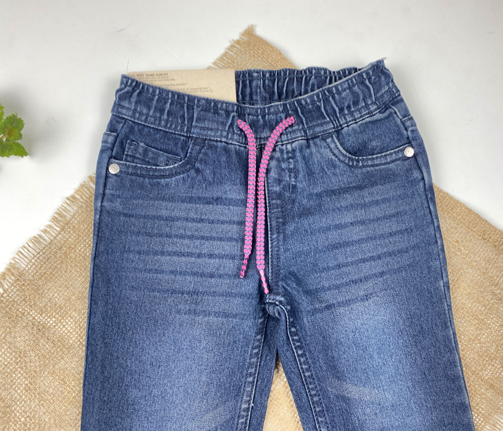 شلوار جین slim fit برند lupilu طرح جیب دار کمرکش بدون دکمه بندک صورتی سورمه ای رنگ
