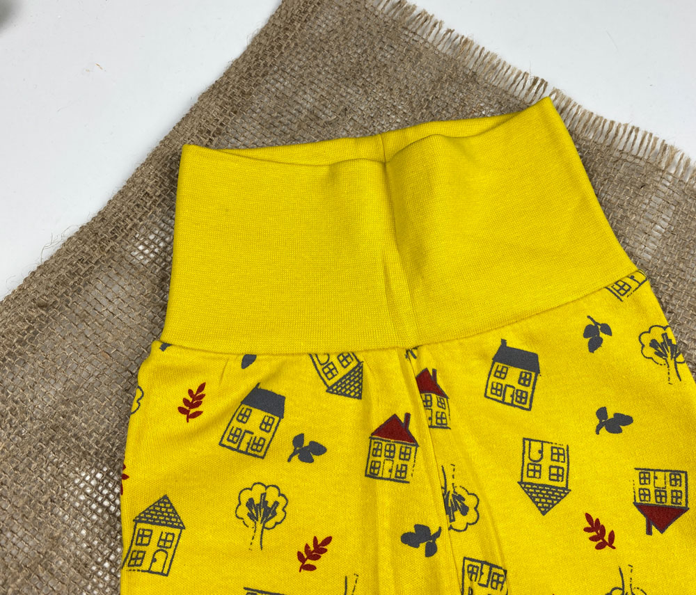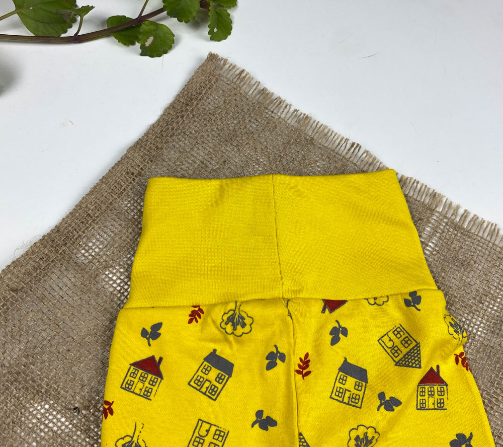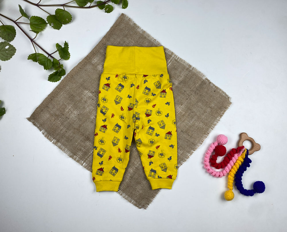 شلوار نوزادی مچ دار برند لوپیلو طرح خانه و درخت کمرکش پهن زرد رنگ – 2 تا 6 ماه