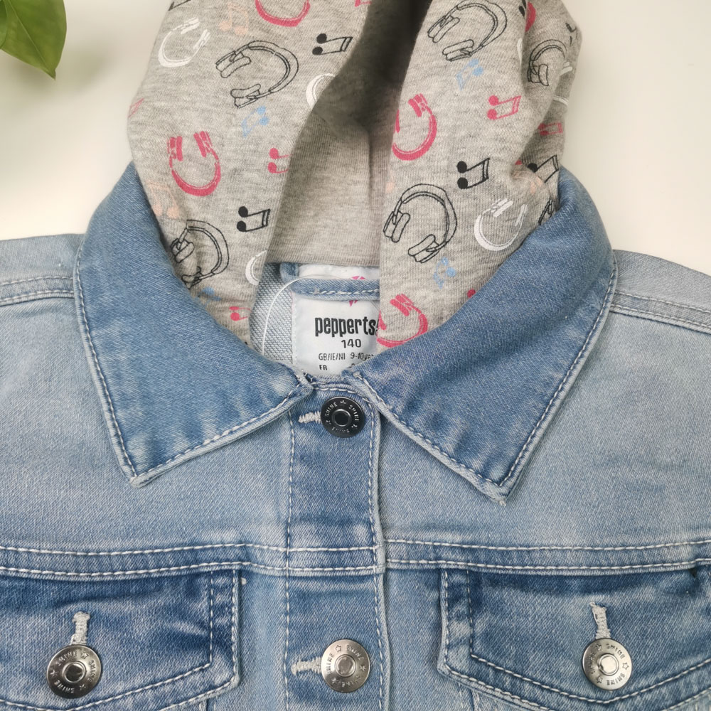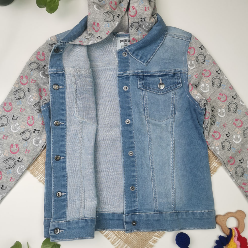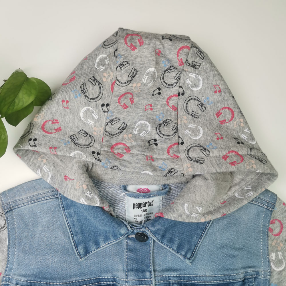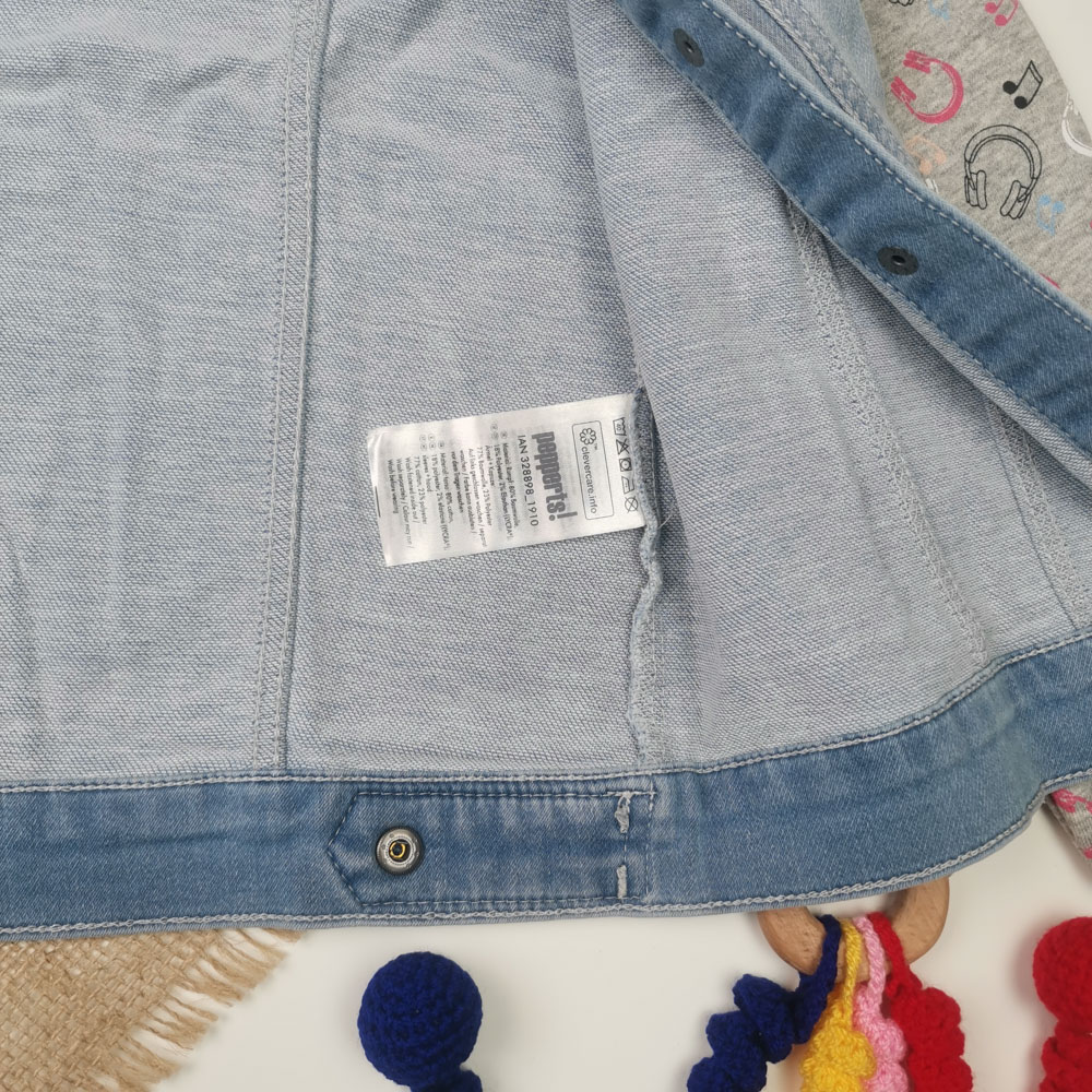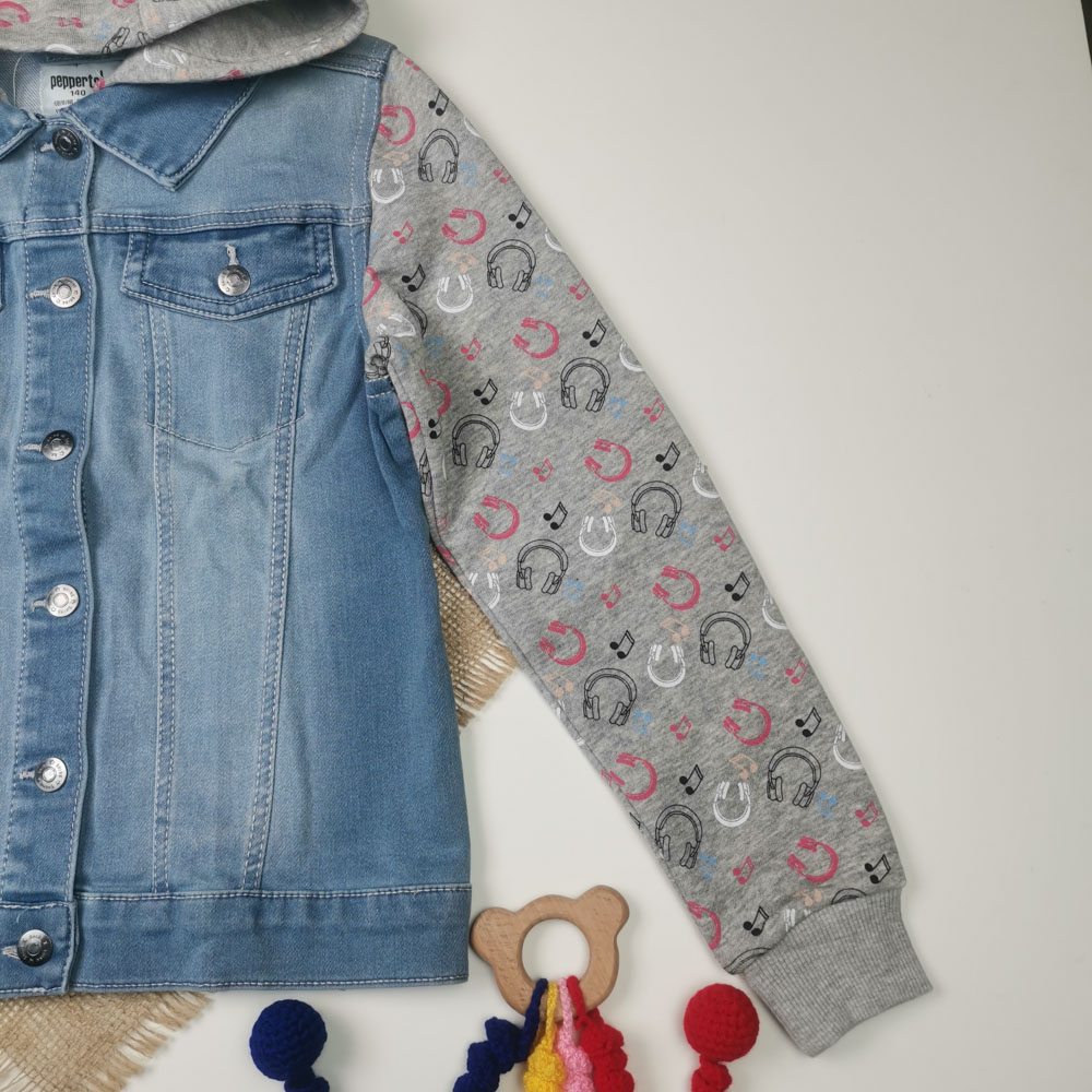 کت جین نوزادی دخترانه آستین بلند برند pepperts طرح موسیقی کلاه دار آبی رنگ